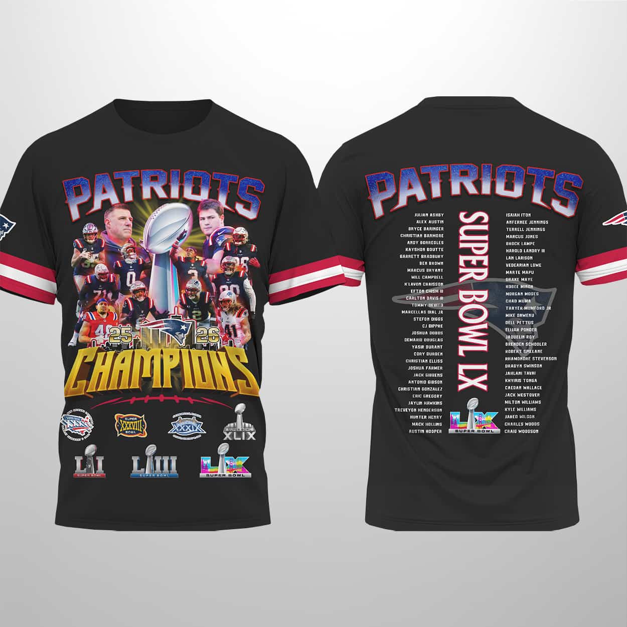 Step into the spotlight with this shirt, a commemorative piece that radiates victory. The front bursts with energy: “PATRIOTS” emblazoned in bold letters above a dynamic collage of players, the gleaming Vince Lombardi Trophy, and the triumphant word “CHAMPIONS” in striking yellow. Surrounding this centerpiece are logos from past SB wins, reminding fans of the dynasty’s legendary. The back continues the celebration with “SB LX” proudly displayed, alongside the roster of names that etched themselves into football history.