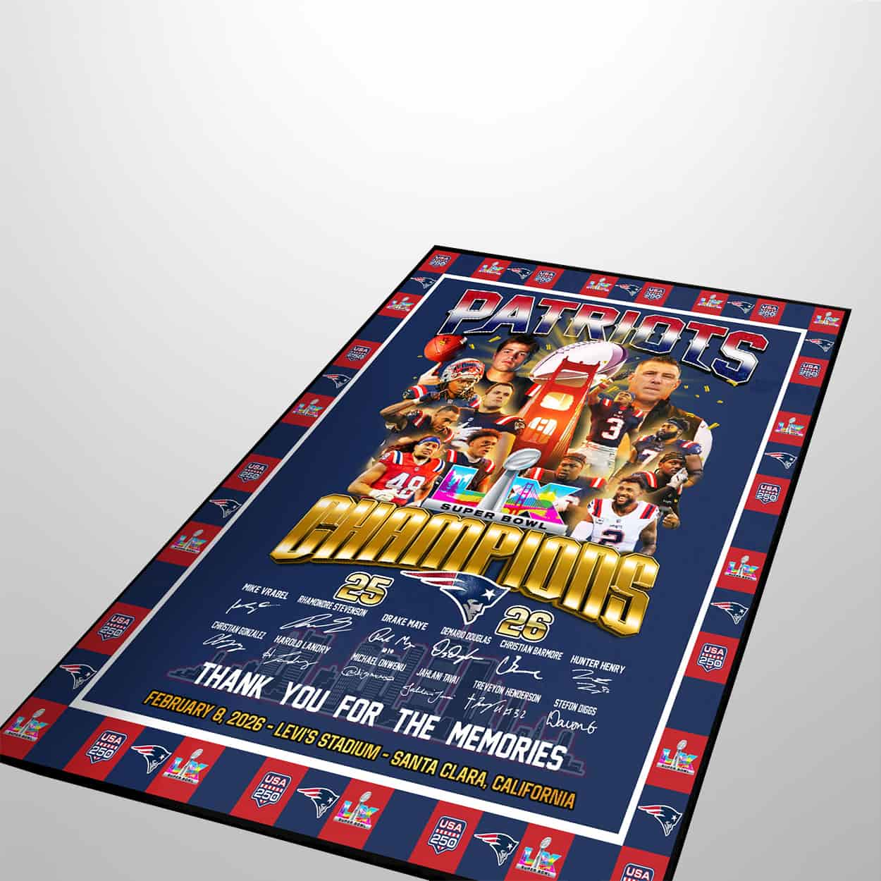 Celebrate the dawn of a new era with this rug. This stunning piece features a collage of the season’s heroes, including breakout star Drake Maye and veteran playmaker Stefon Diggs, set against the backdrop of the Golden Gate Bridge to honor the victory at Levi’s Stadium. The design is anchored by a bold, golden “CHAMPIONS” banner and the SB LX logo, flanked by the years ’25 and ’26. Below the action, a “Thank You For The Memories” dedication is paired with the printed signatures of the roster, from Mike Vrabel to Rhamondre Stevenson.