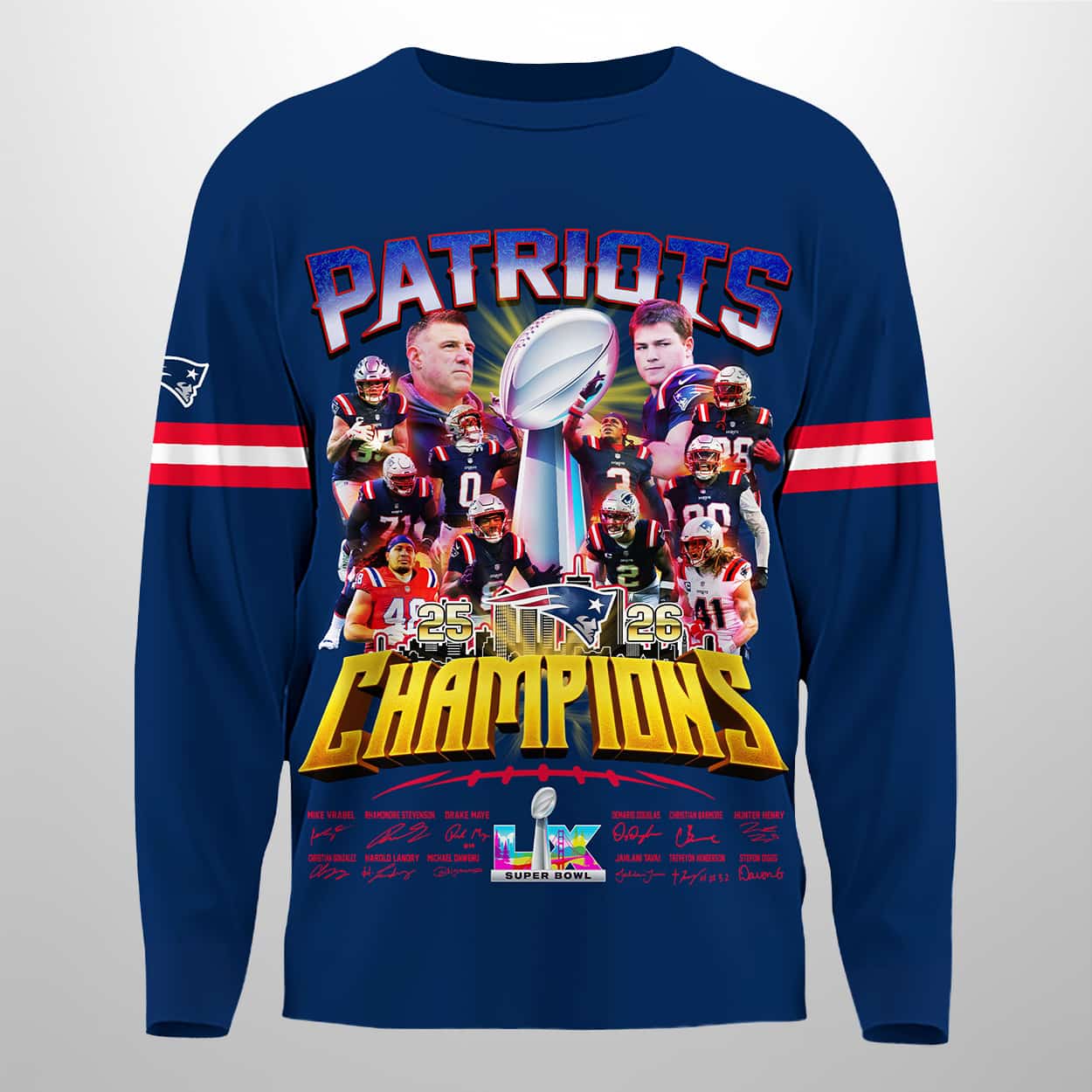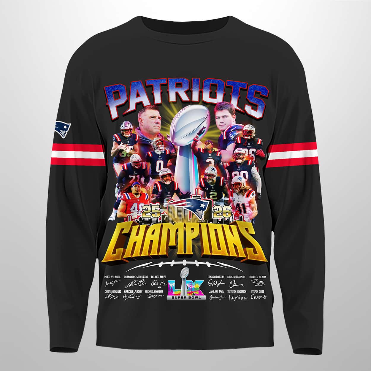 Celebrate the Patriots’ unforgettable triumph with this sweatshirt, a wearable tribute to greatness. The front design explodes with energy: the Vince Lombardi Trophy gleams at the center, surrounded by Patriots players frozen in dynamic action poses. Above, “PATRIOTS” commands attention in striking letters, while “CHAMPIONS” blazes across the bottom in bold yellow, leaving no doubt about who ruled the season. The Super Bowl LX logo anchors the design, and the sleeves feature red and white stripes with the Patriots emblem proudly displayed on the left arm—every detail a nod to team spirit and victory.