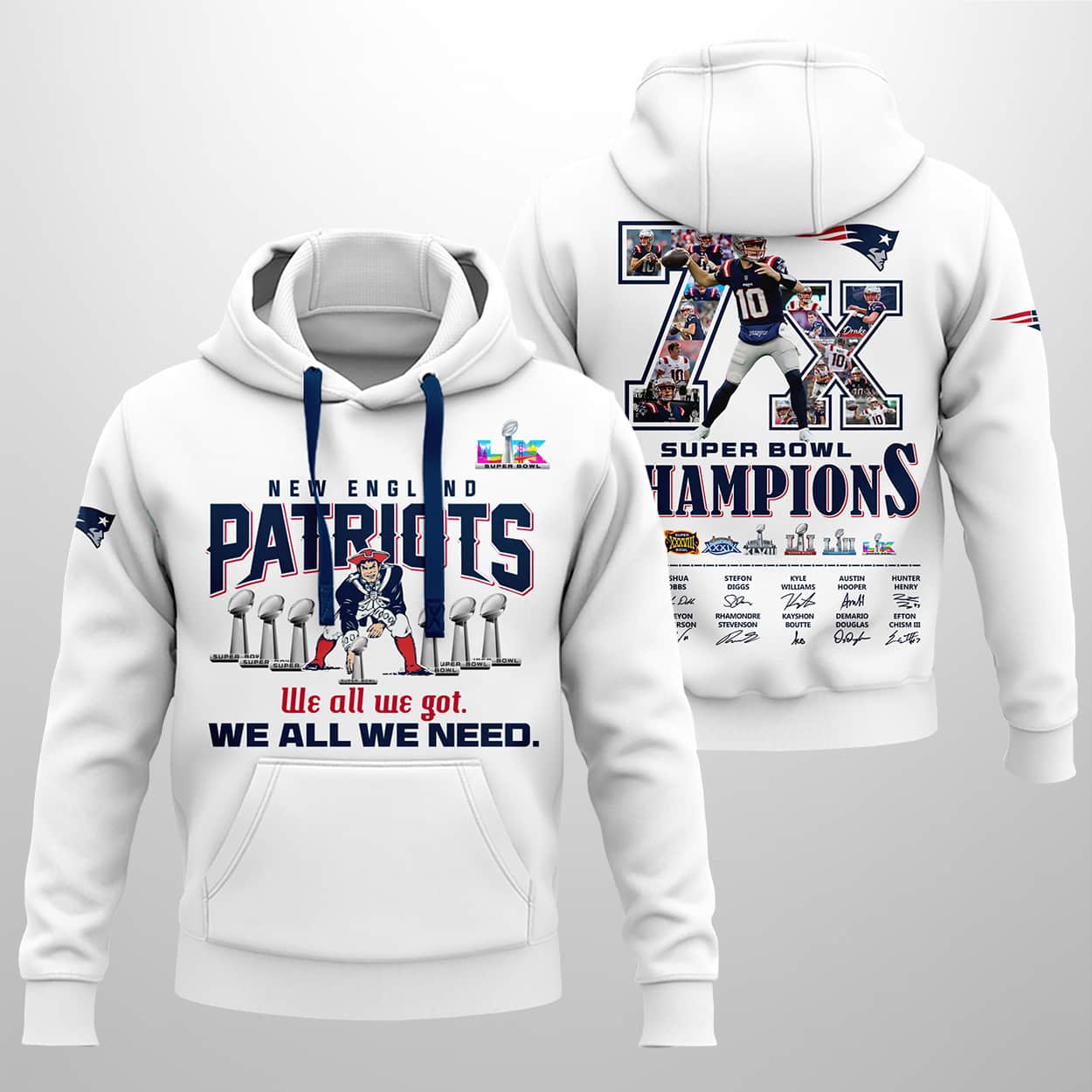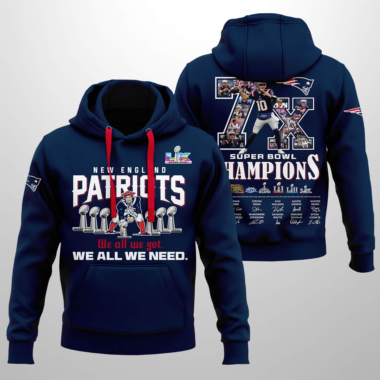 This hoodie is a celebration stitched into every detail. The front boldly declares “PATRIOTS,” paired with five shining Lombardi trophies, a dynamic player illustration, and the rallying cry: “We all we got. WE ALL WE NEED.” A small Super Bowl logo sits proudly on the chest, while the sleeves carry the Patriots emblem for that extra touch of team spirit. Turn it around, and the back explodes with triumph: “7X SB CHAMPIONS” emblazoned across, with the number 7 filled with iconic player moments.