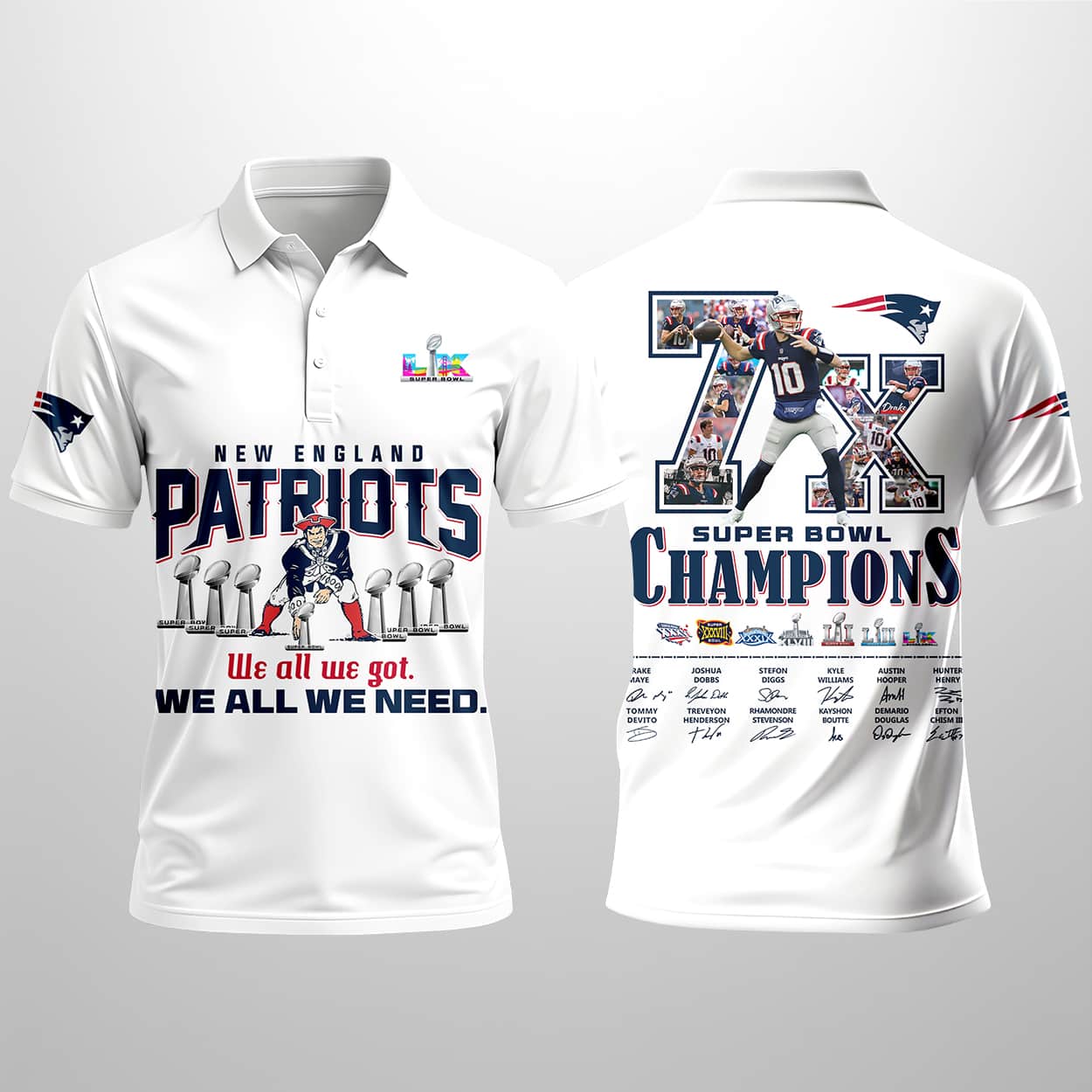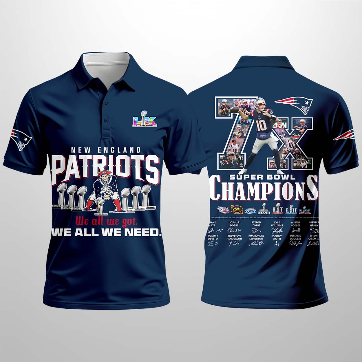 This navy polo is a walking highlight reel of Patriots greatness. The front proudly declares “PATRIOTS” above six gleaming Vince Lombardi Trophies, paired with the rallying cry “We all we got. WE ALL WE NEED.” A subtle Super Bowl LIII emblem adds a touch of legacy detail. Turn it around, and the back explodes with bold text: “7X SB CHAMPIONS.” The “7X” itself is filled with dynamic images of players and unforgettable game moments, while seven trophies line up below, each marked with Roman numerals, years, and the opponents conquered—including the 2025 triumph over the Seahawks in SB LX.