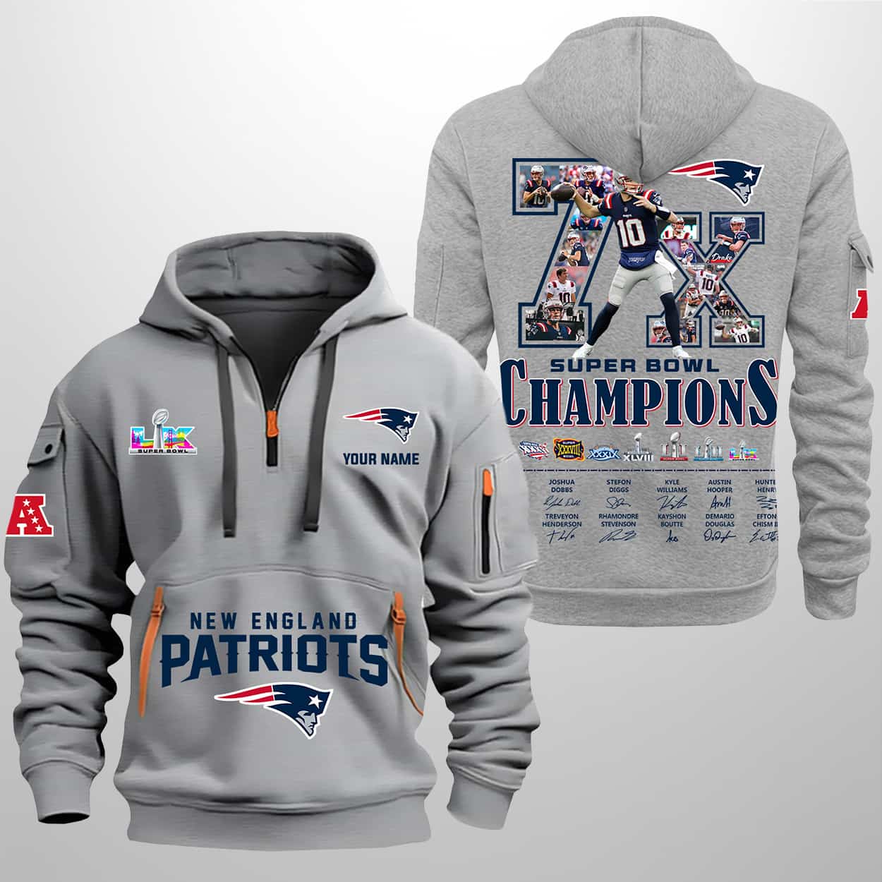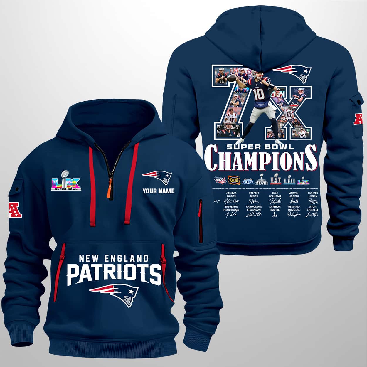 This quarter zip hoodie is more than just fan gear—it’s a victory banner you can wear. The front proudly showcases “PATRIOTS” alongside the iconic team logo, with a customizable name area so you can stamp your own identity into the dynasty. The sleeves feature commemorative patches, including the SB insignia, while the back steals the show: “7X SB CHAMPIONS” blazes across, with the number “7” filled with dynamic player imagery and the number “10” at the center, marking the team’s triumphant SB LX win over the Seattle Seahawks. Below, the timeline of championships—2001, 2003, 2004, 2014, 2016, 2018, and now 2026—reminds everyone that greatness is tradition in Foxborough.
