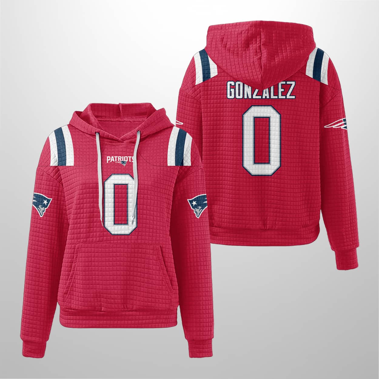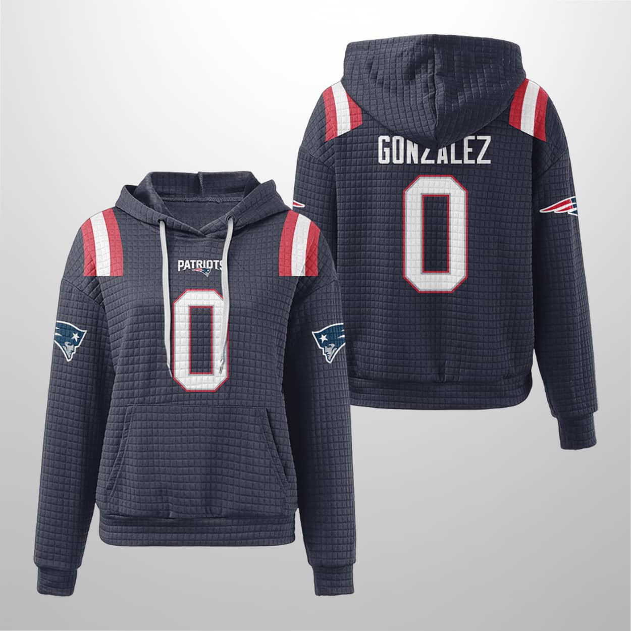 Step into the spotlight with this hoodie—a fan favorite that blends classic team pride with modern swagger. This deep navy hoodie features bold red and white shoulder stripes that bring instant energy to your look. Across the chest, “PATRIOTS” stands tall in crisp white, perched above a striking white-and-red number “0” that commands attention. Flip it around and you’ll find “GONZALEZ” printed above the same powerful number, making it clear who you’re backing. With the Patriots logo patch on each sleeve, this hoodie delivers a full-field tribute to one of the game’s rising stars.