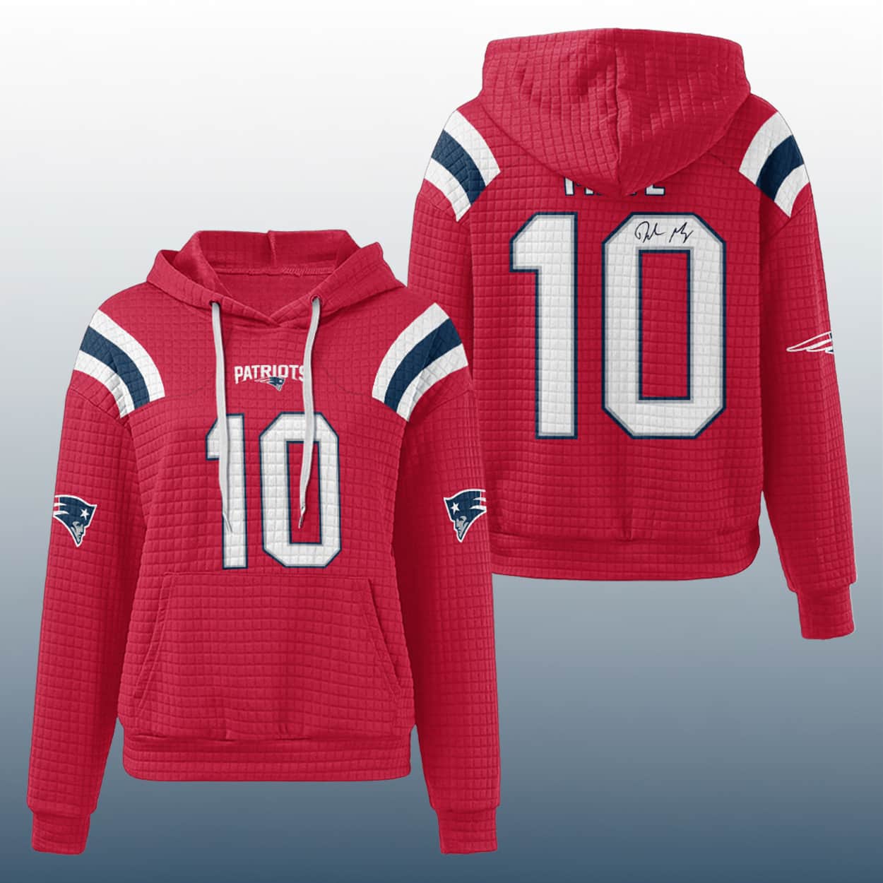 This hoodie is a must-have for fans ready to embrace the next chapter in Foxborough. This dark blue hoodie features a quilted waffle texture that adds depth and style, while red and white shoulder stripes bring a classic gridiron vibe. On the front, “PATRIOTS” sits proudly above the number “10” in bold white digits outlined in red. The sleeves sport the iconic Patriots logo, and the back showcases the number again—this time with Drake Maye’s signature above it, making it a wearable shoutout to the team’s rising star.