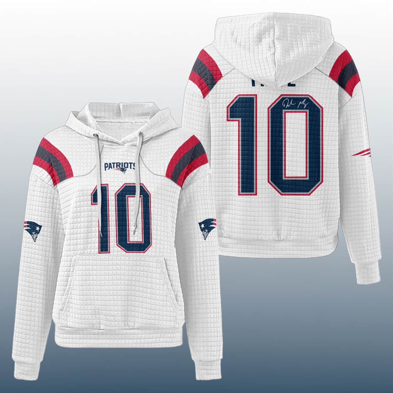 Show off your Patriots pride with the Patriots Drake Maye 10 Signature Waffle Hoodie—a bold, textured tribute to the future of New England football.