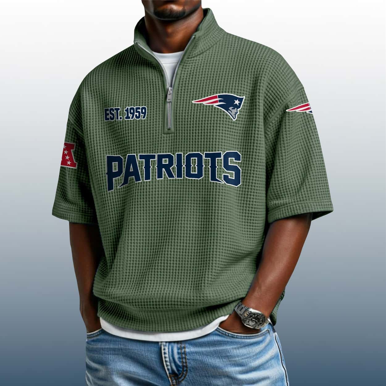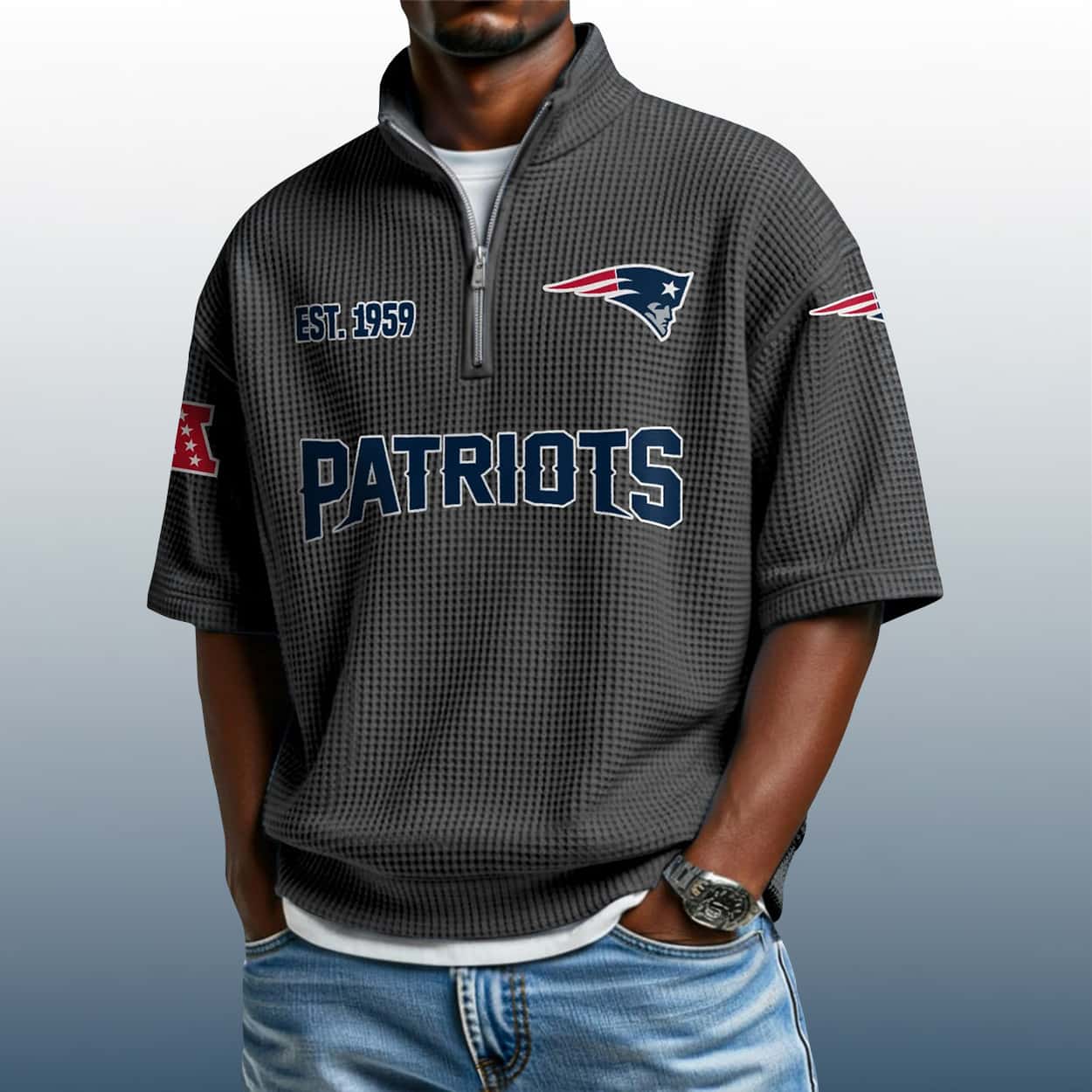 Celebrate your Patriots pride with the Patriots Est 1959 Waffle Stand Collar Half Zip Polo Shirt—a bold, heritage-inspired top that blends classic team spirit with modern edge. Perfect for fans who lead with confidence.