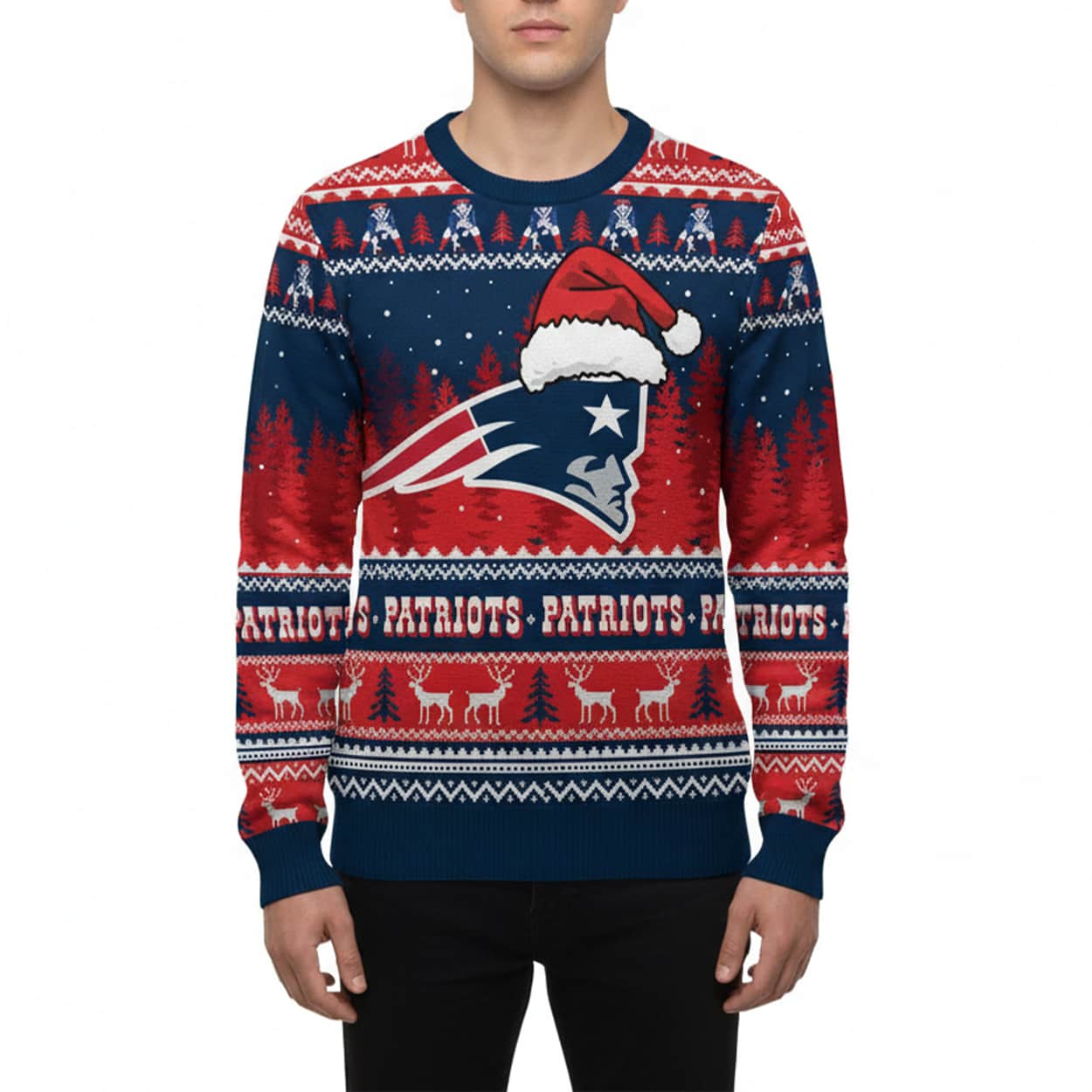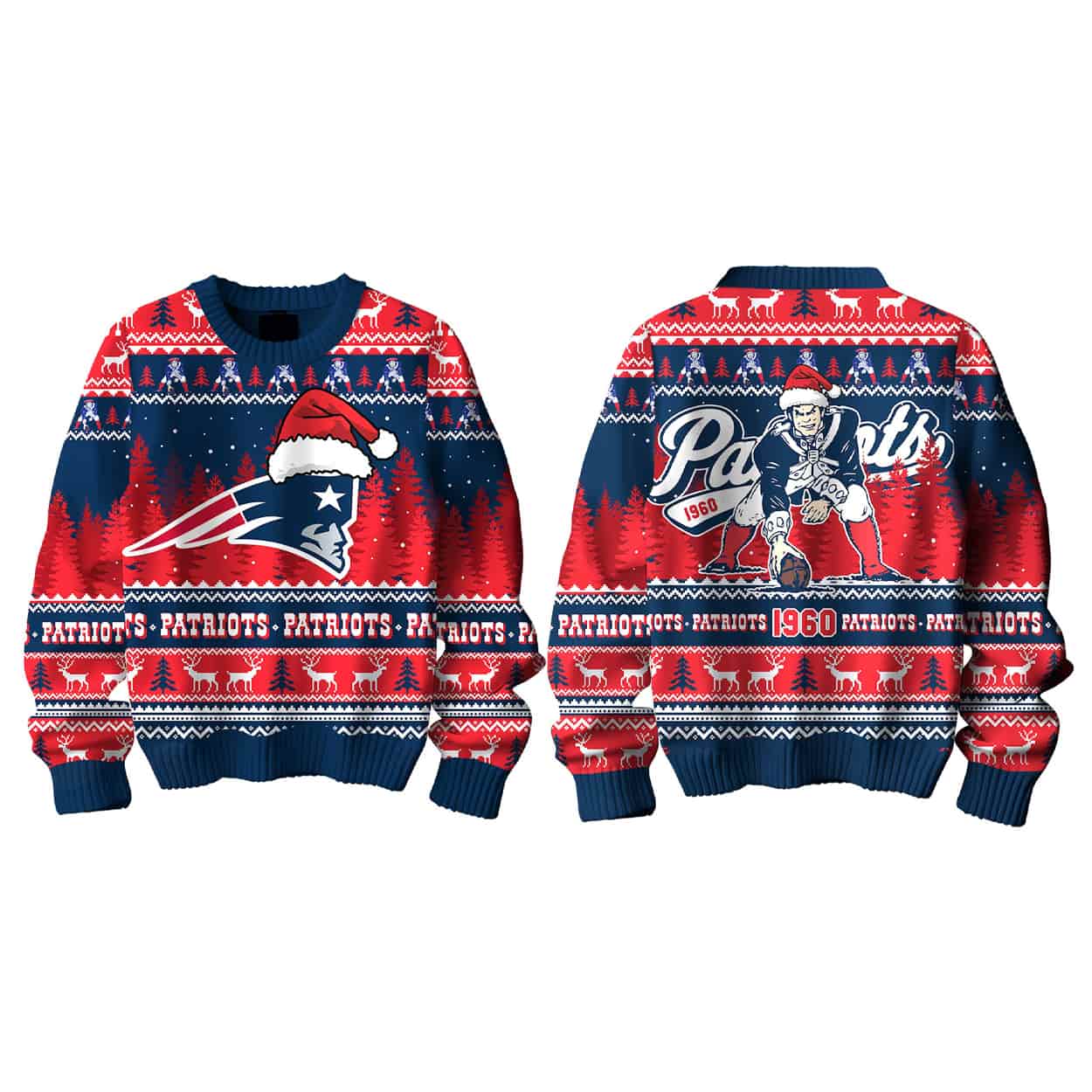 This red, white, and blue masterpiece features the iconic Patriots logo sporting a Santa hat—because even Belichick deserves a little cheer. Reindeer, snowflakes, and pine trees dance across the knit like a playbook gone merry. The back showcases a vintage Patriots player crouched in a ready stance, also rocking a Santa hat, flanked by the stylized “Patriots” script and the founding year “1960.” Repeating “PATRIOTS” bands wrap the chest and sleeves like a defensive line of holiday spirit.