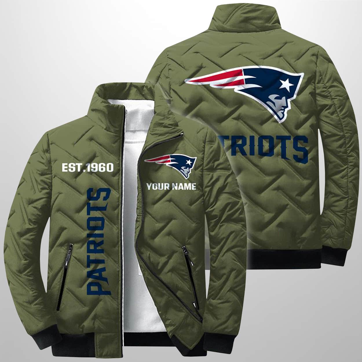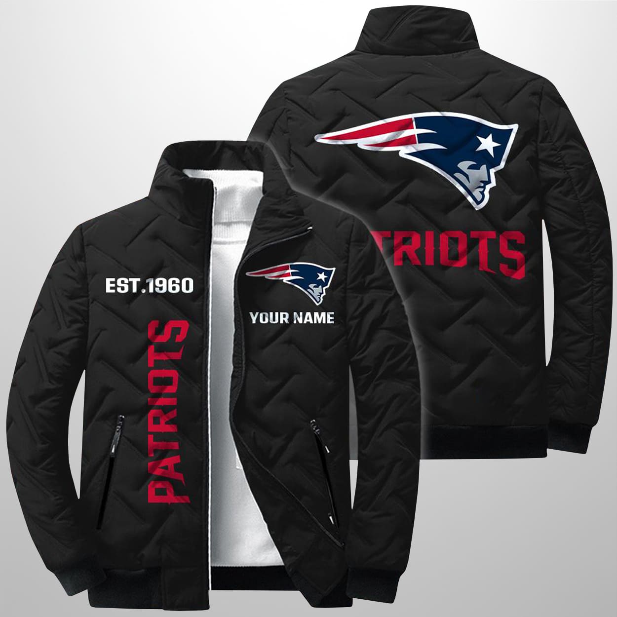 This jacket is a must-have for fans who live and breathe Patriots football. This navy blue stunner features the iconic Patriots logo on the left chest, personalized with “YOUR NAME” beneath it—because being a fan is personal. On the right chest, “EST. 1960” pays homage to the team’s founding year, while “PATRIOTS” runs vertically down the left side like a sideline sprint. Turn it around and the back makes a statement: a bold Patriots logo paired with “PATRIOTS” in striking red letters that shout team spirit louder than a fourth-quarter touchdown.