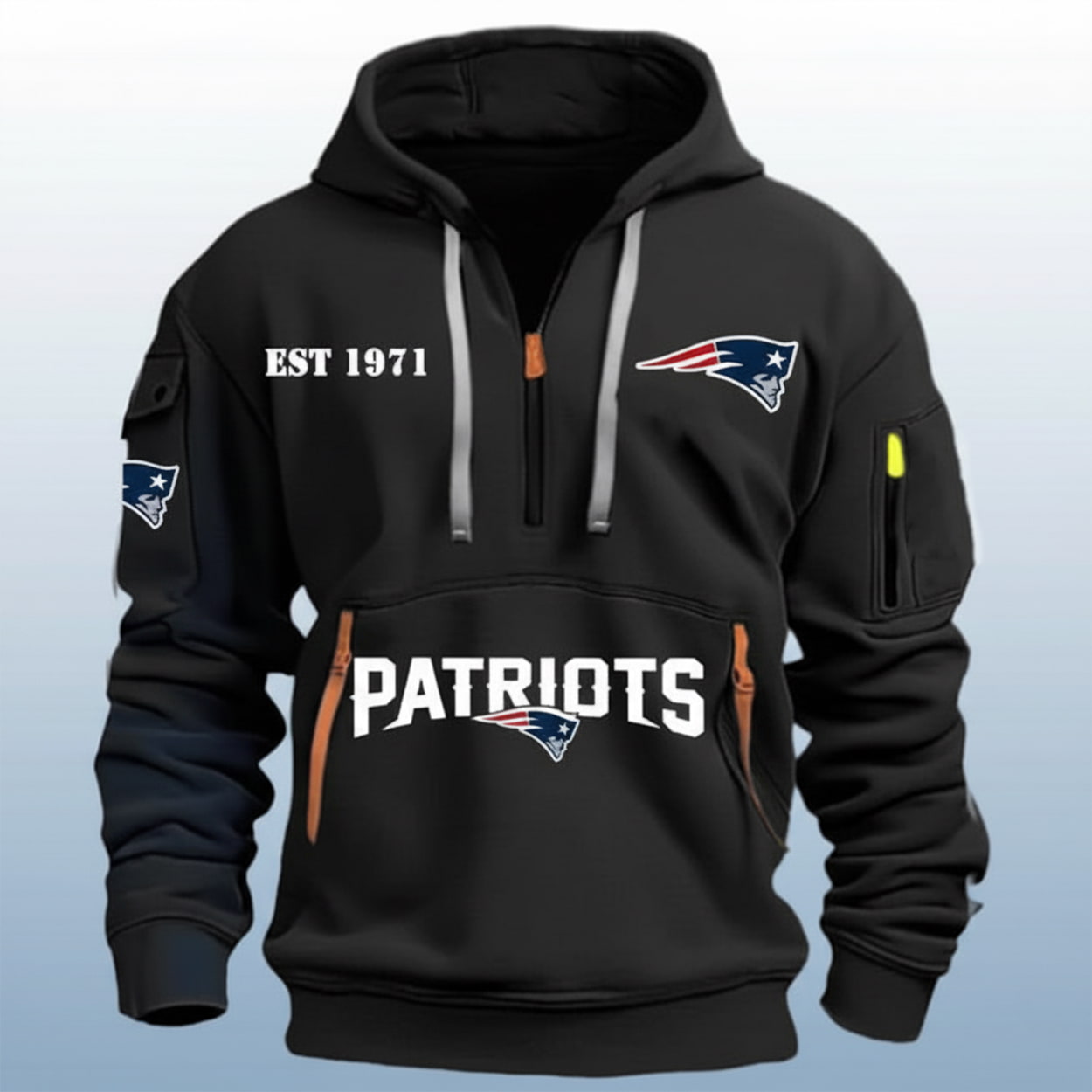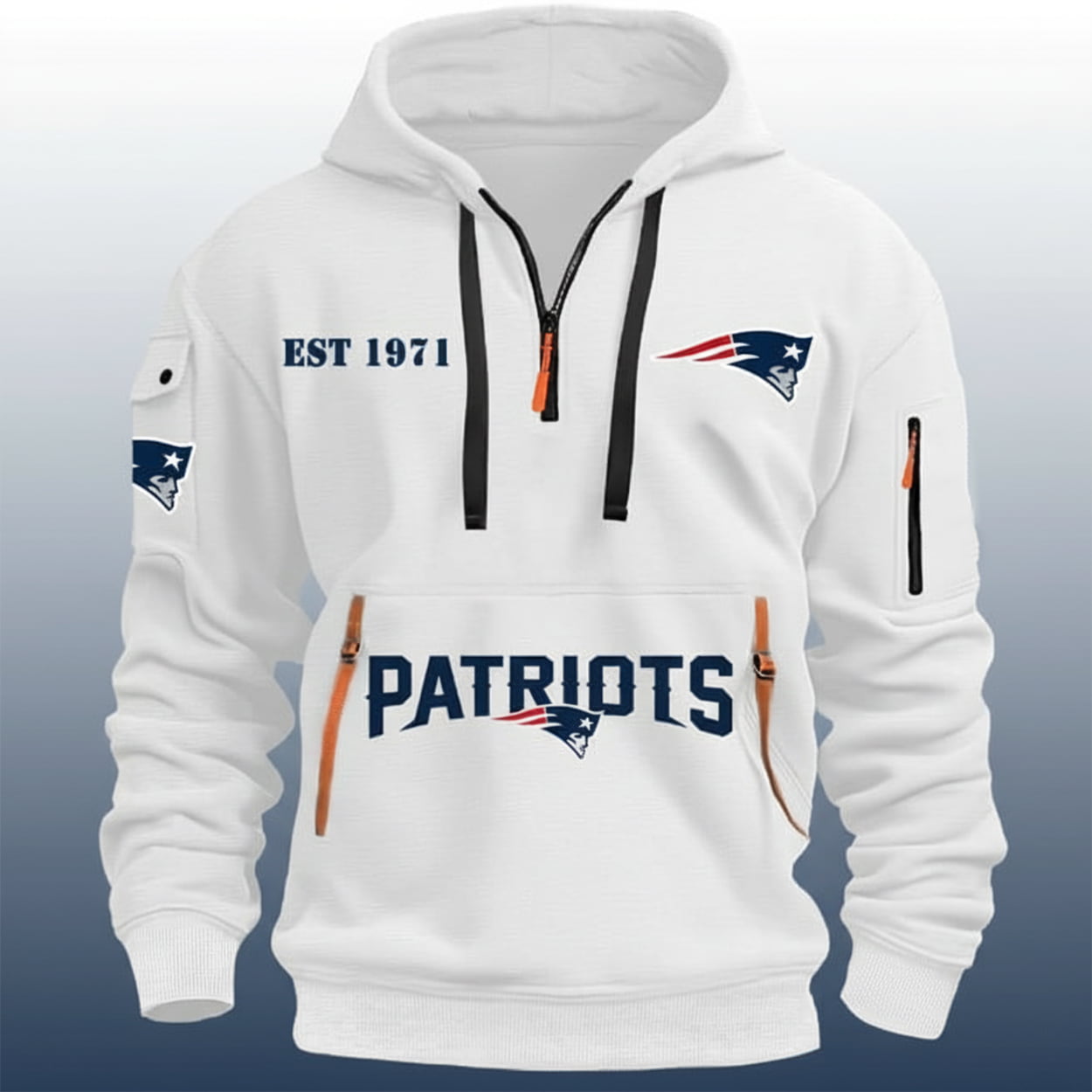 Across the front, “PATRIOTS” shouts in bold navy like a halftime speech from Belichick himself. The iconic Patriots logo—our founding father with a facelift—appears on the chest and sleeve, ready to blitz mediocrity. “EST 1971” sits above the chest logo, marking the birth of a dynasty and, coincidentally, the last time bipartisanship had a winning season. Orange zipper accents add a splash of rebellion, while the black drawstrings say, “I’m here to tailgate and dismantle bad policy.”