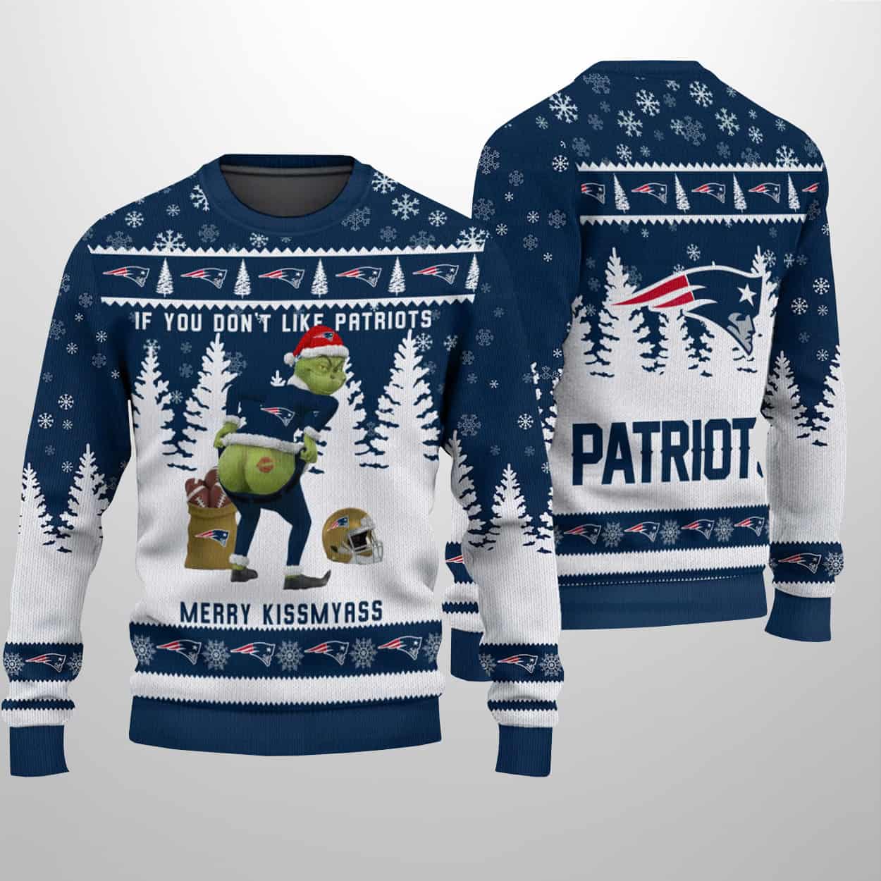 Get ready to tackle the holidays with humor and team spirit in this sweater. This eye-catching design features a mischievous Grinch dressed in full Santa gear, clutching a sack stuffed with helmets. Set against a wintry backdrop of snowflakes and pine trees on a bold blue canvas, the front delivers a hilarious message: “IF YOU DON’T LIKE PATRIOTS,” followed by the unapologetic punchline, “MERRY KISSMYASS.” Flip it around and you’ll find the unmistakable Patriots logo and bold “PATRIOTS” lettering, surrounded by festive patterns that keep the cheer going from every angle.