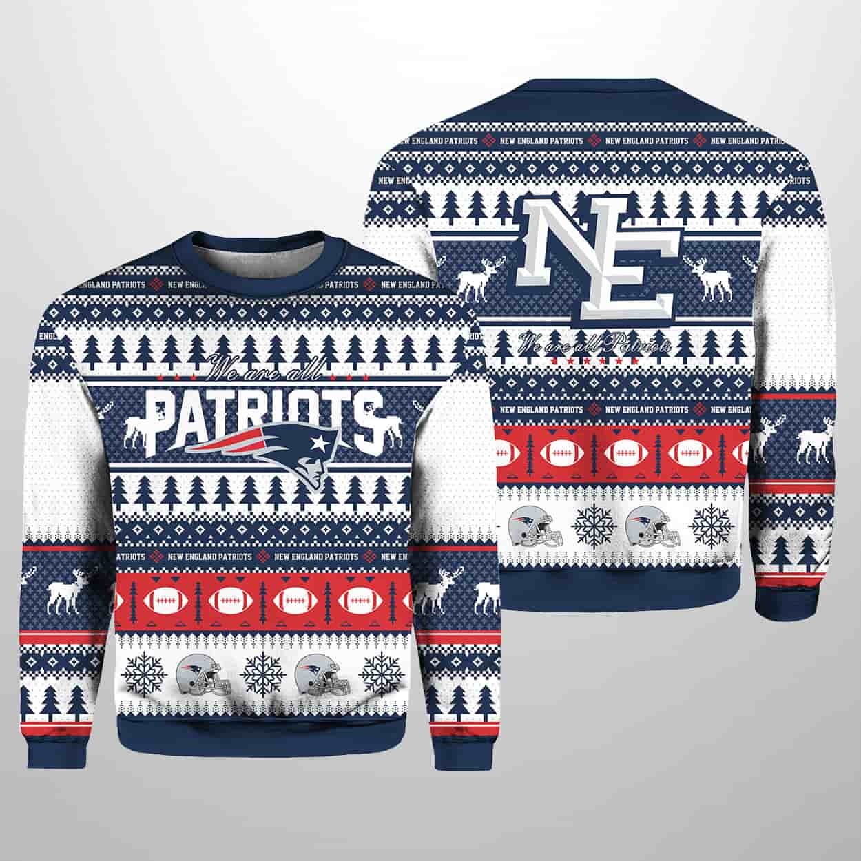 Show your New England Patriots pride this holiday season with this Patriots Rivalries We Are All Patriots 2025 Christmas Ugly Sweater. Features the iconic logo, football motifs, and holiday cheer.