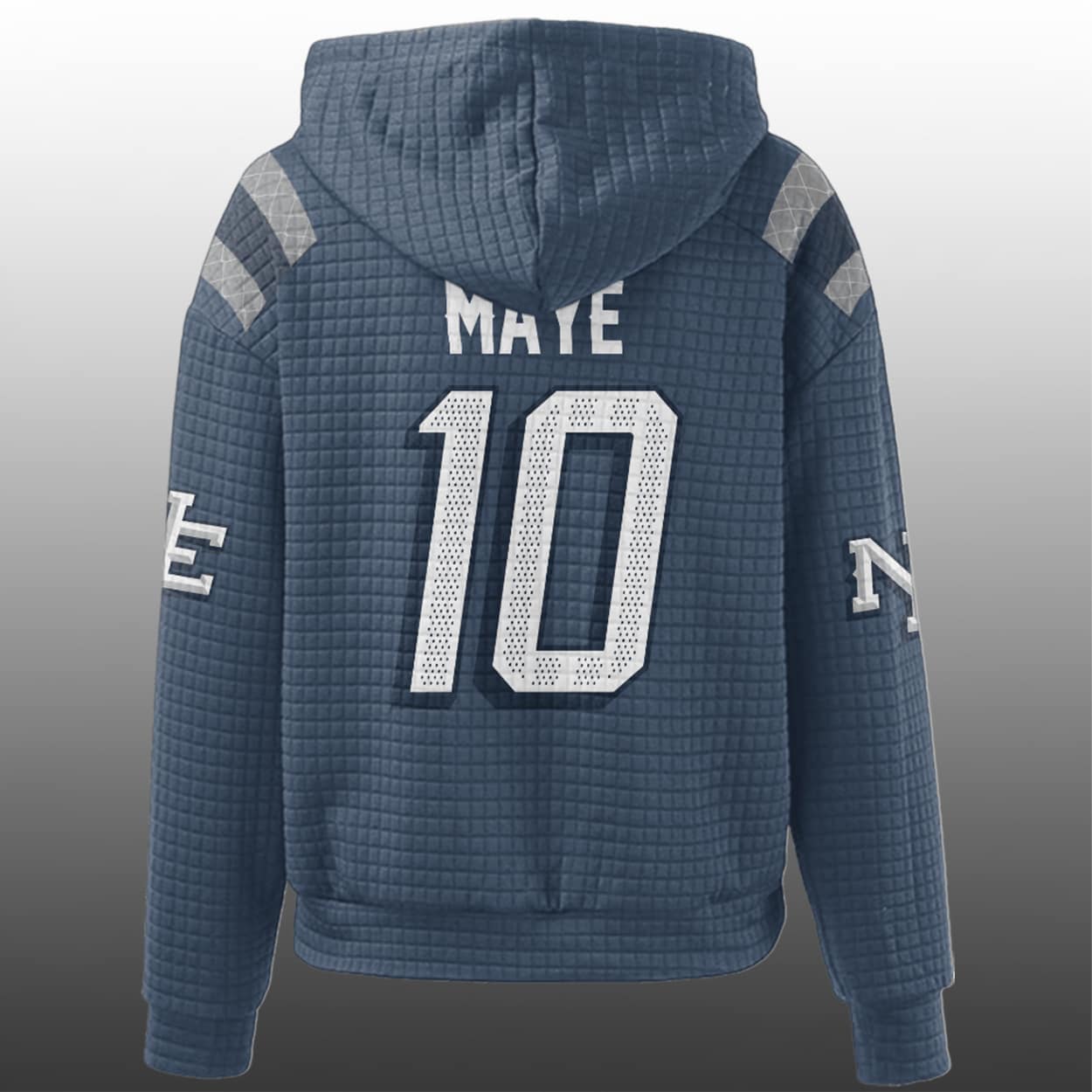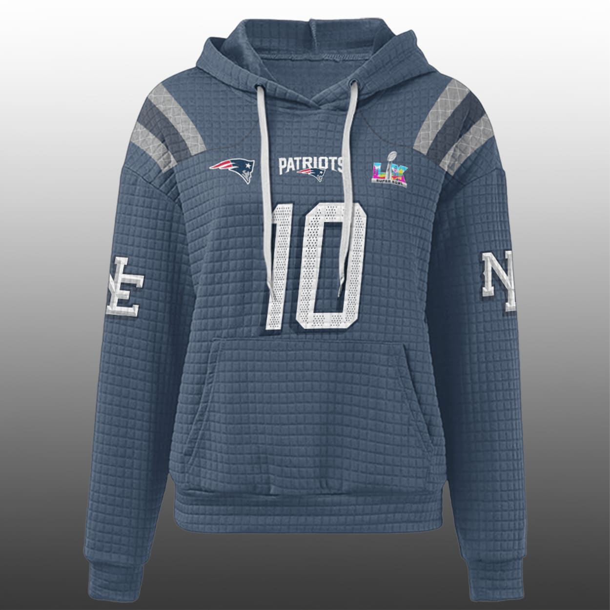 This hoodie is your ultimate fan armor. Drenched in bold blue, this hoodie rocks the number “10” front and back, with “MAYE” stamped across the shoulders like a rallying cry. The front features a lineup of iconic graphics — the Patriots logo, the word “PATRIOTS,” and a gleaming SB LX badge that screams championship pedigree. White and gray stripes race down the sleeves, while “NE” on the upper arms makes it clear: this is New England territory.