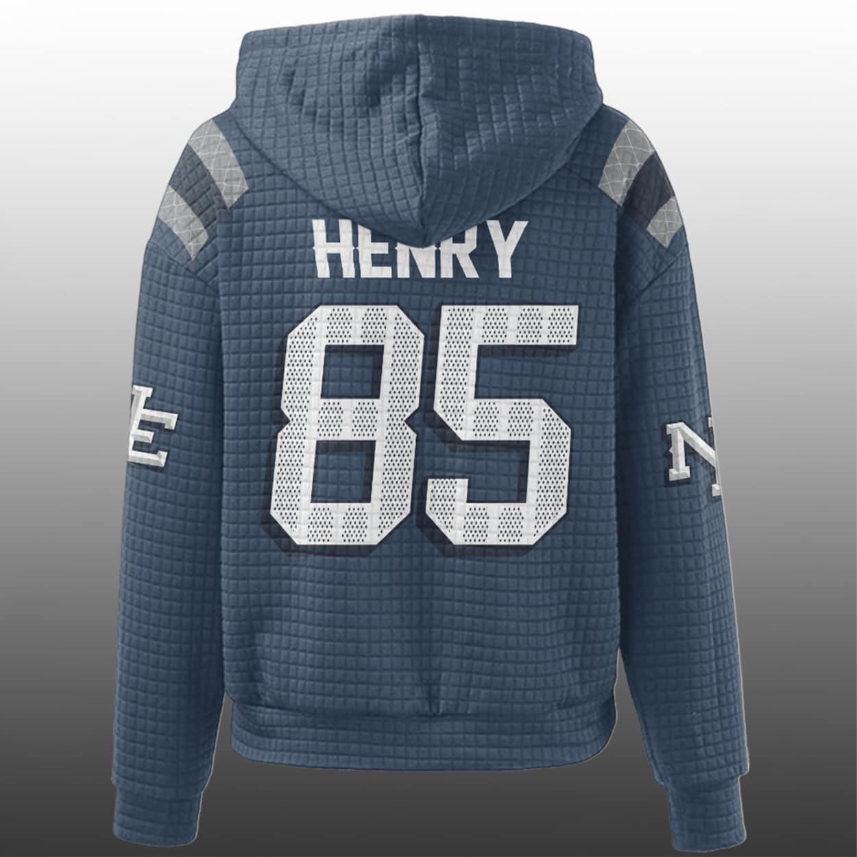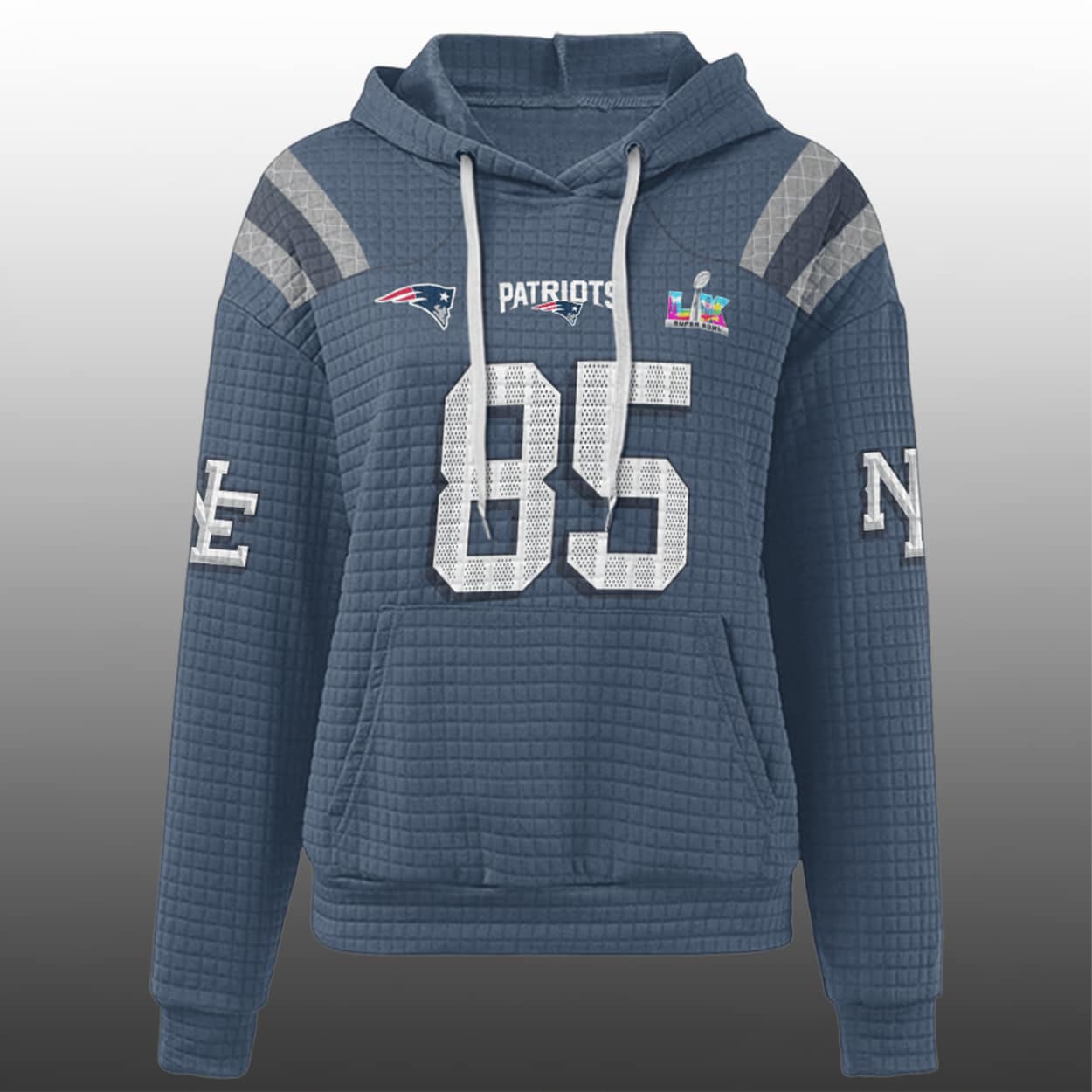 Step into the spotlight with this hoodie—a fan-favorite that blends classic team spirit with modern swagger. This hoodie features the number “85” front and back in bold white block lettering, with “PATRIOTS” stamped proudly across the chest. The front also sports the team’s iconic logo and a vibrant SB LX badge, adding a splash of championship glory. On the back, “HENRY” sits above the number, making it clear you’re backing one of New England’s top playmakers. Gray and white sleeve stripes add a sporty edge, while the “NE” detail on the left sleeve seals the deal.