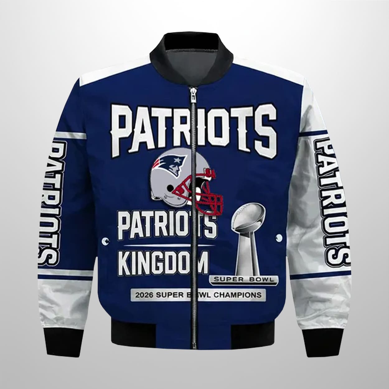Celebrate victory in style with the Patriots SBowl LX 2026 Champions Bomber Jacket—a bold, playful tribute to New England’s championship glory and fan pride.