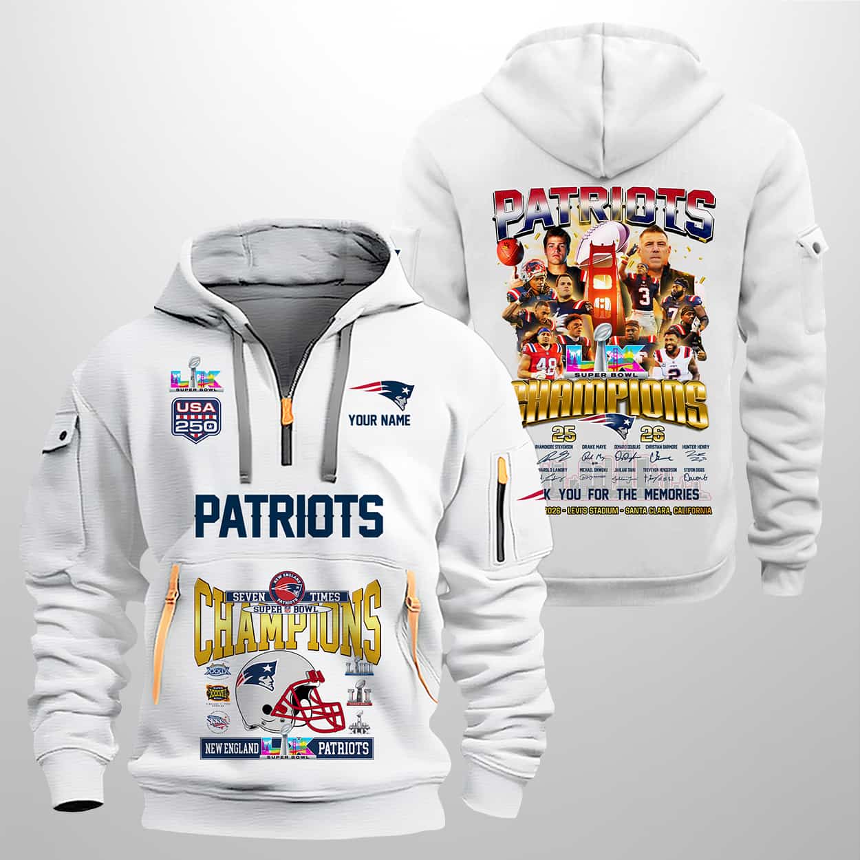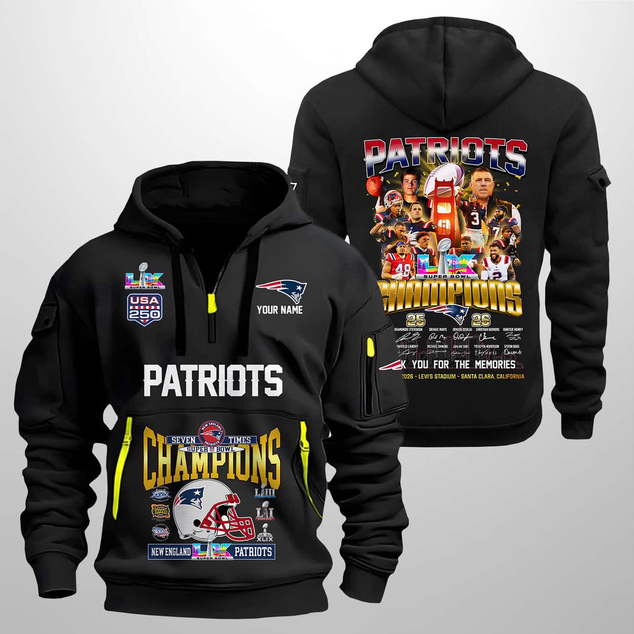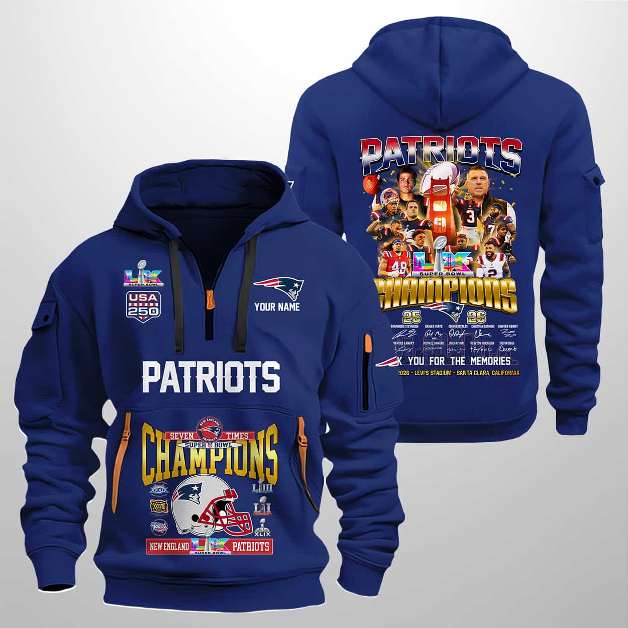 Celebrate the New England Patriots’ legendary seven-time SB triumphs with the Patriots Seven-Times SBowl Champions 25-26 Quarter Zip Hoodie—a statement piece that blends team pride, history, and unforgettable memories.