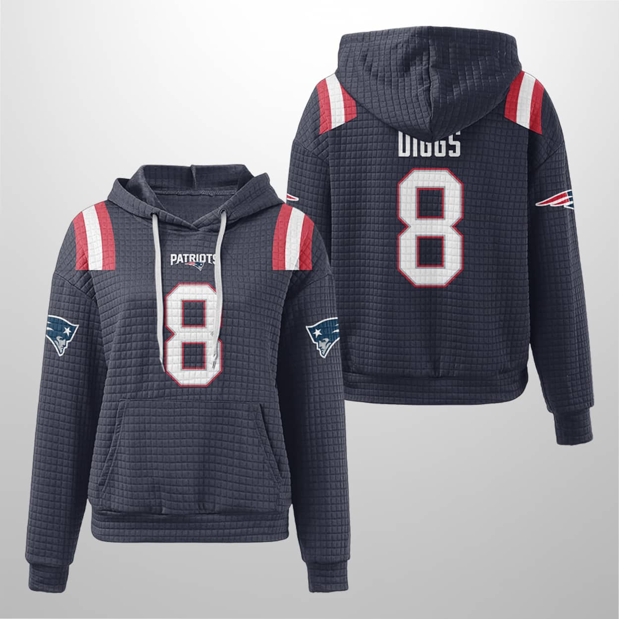 Turn heads and break tackles in style with this hoodie — a sleek, game-day essential that blends jersey vibes with streetwear swagger. This dark blue hoodie features the number 8 front and back in crisp white, framed by “PATRIOTS” across the chest and “DIBBS” on the back, giving it a bold, personalized edge. Red and white shoulder stripes add a pop of classic team color, while the Patriots logo on the sleeves seals the deal with authentic flair. The drawstring hood and front pocket bring comfort and cool to every snap.