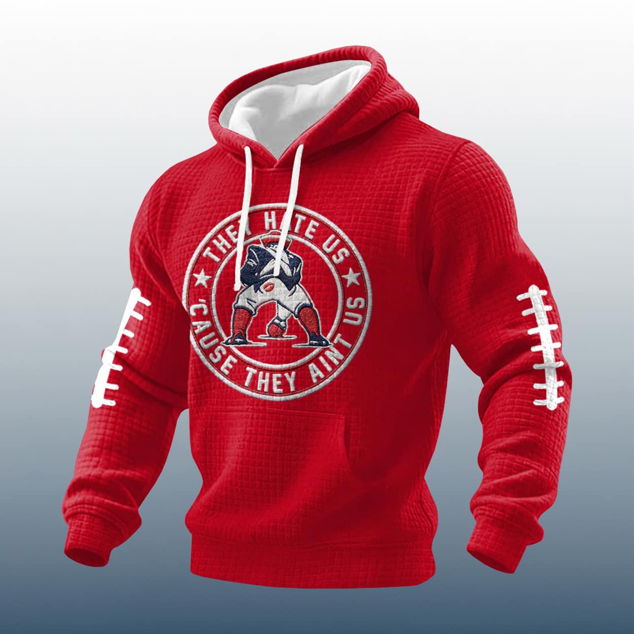 Turn heads and stir rival envy with the Patriots They Hate Us Cause They Ain’t Us Printed Waffle Hoodie—bold, cheeky, and game-day ready.