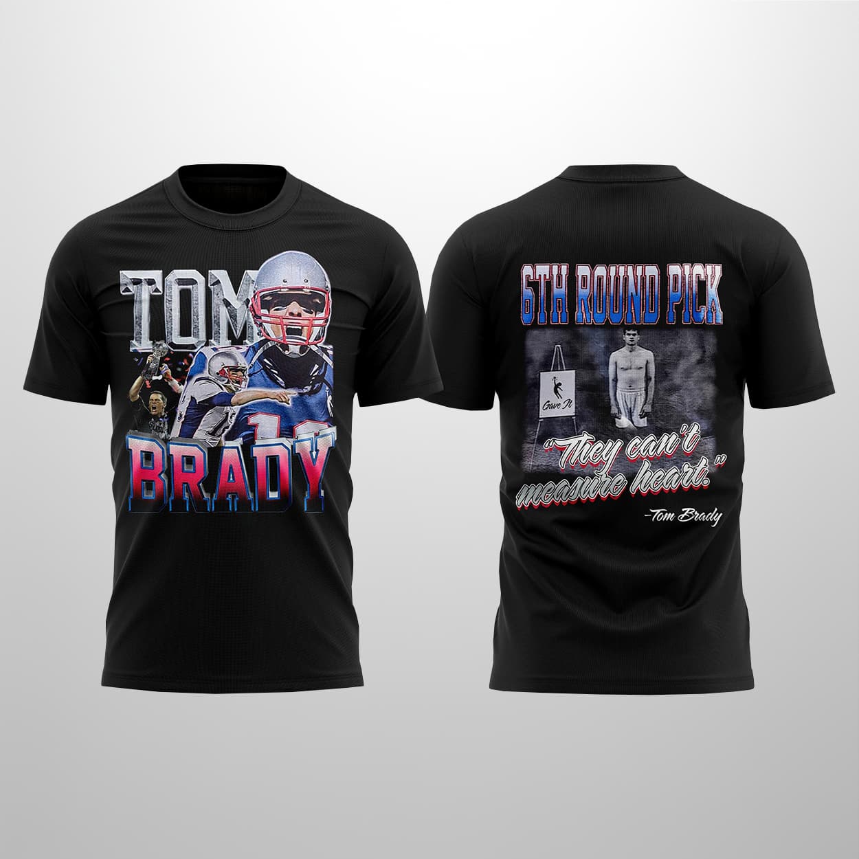 This shirt is a tribute to the ultimate comeback story in history. On the front, bold “TOM BRADY” lettering anchors dynamic action shots of the quarterback in full gear, set against a red, white, and blue palette that nods to his Patriots roots. Flip it over and the message hits harder: “6TH ROUND PICK” blazes across the top, followed by Brady’s iconic quote—“They can’t measure heart.”