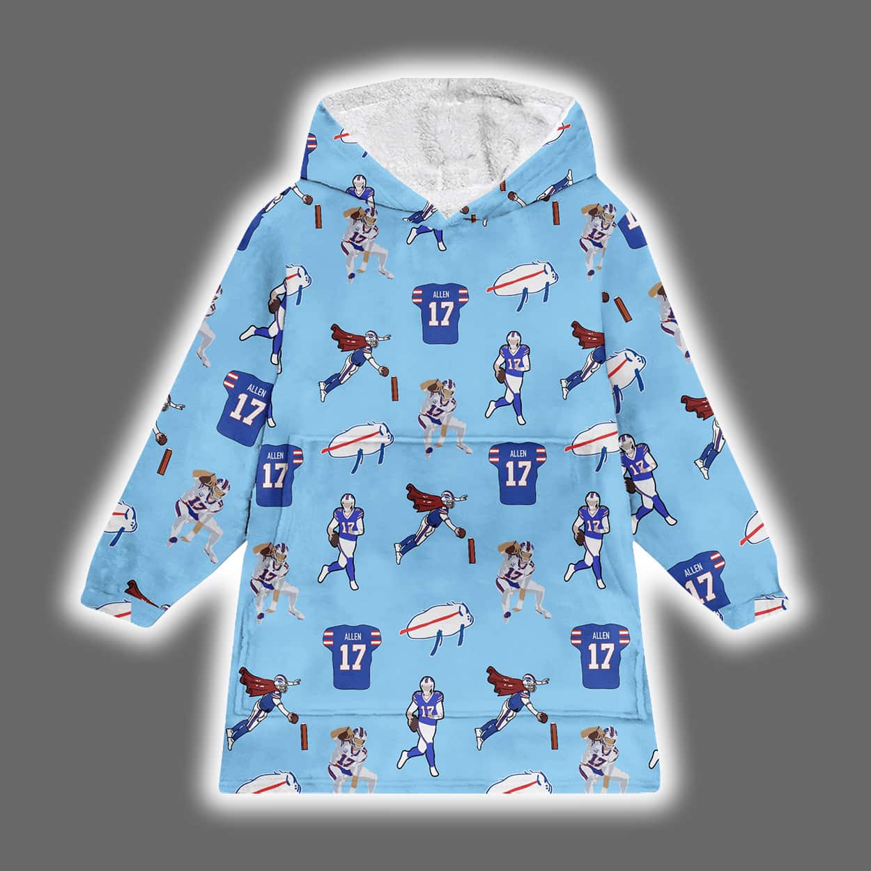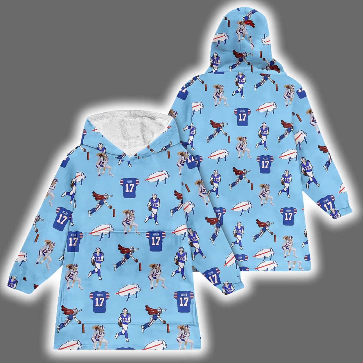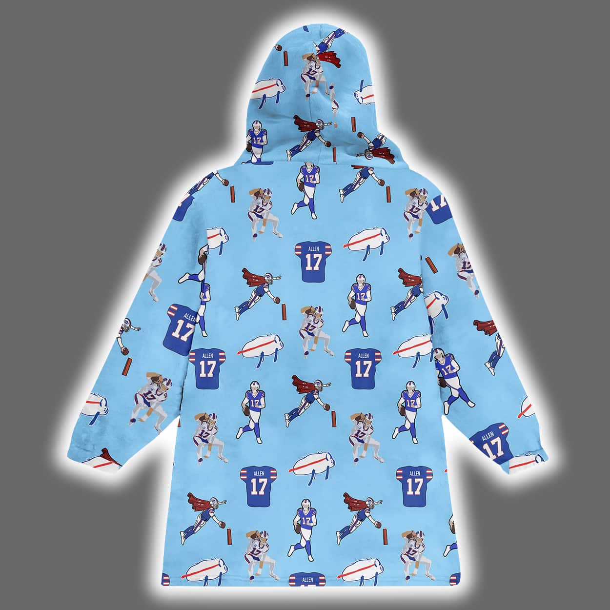 Get ready to huddle up in style with this hooodie—a vibrant celebration of football energy and cozy vibes. Drenched in a cheerful blue, this hoodie bursts with dynamic illustrations of football players mid-action, goalposts, footballs, and jerseys marked with the number “17”—a clear nod to Buffalo’s star quarterback. The graphics are scattered across the entire hoodie, front and back, creating a full-patterned look that’s as fun as a touchdown dance.