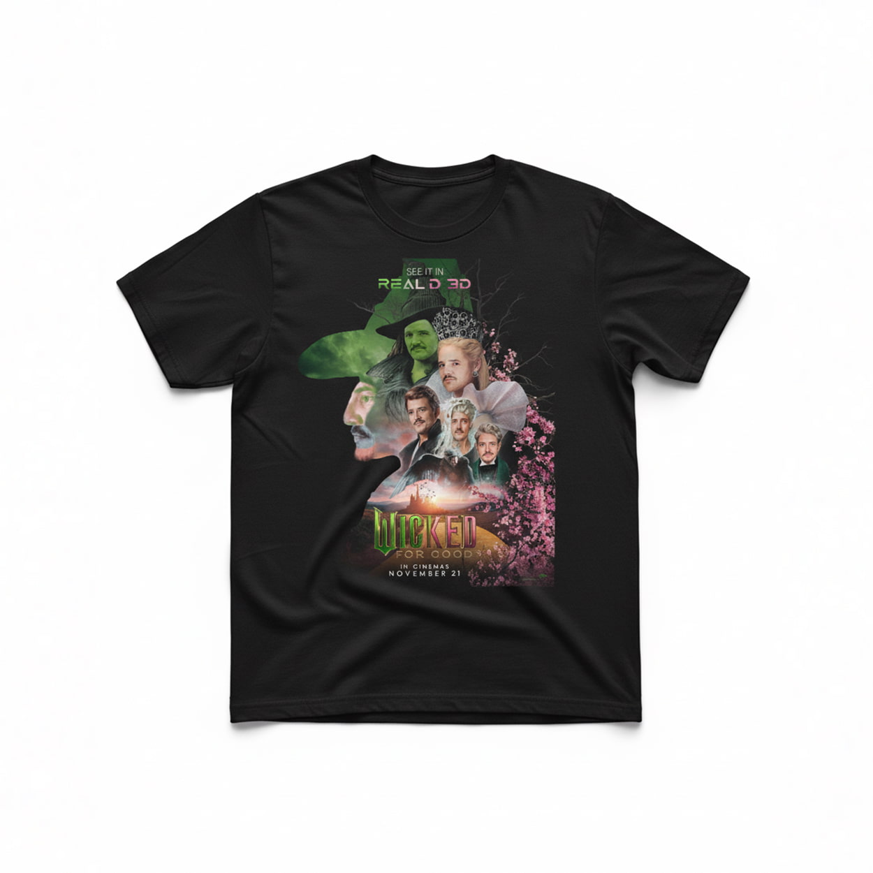 This isn’t just a shirt—it’s a full-blown meme moment you can wear. This shirt showcases a surreal collage where every character from Oz is reimagined as Pedro Pascal himself. From the green-skinned Wicked Witch to the radiant Glinda, Pascal’s many faces dominate the design in a riot of color and whimsy. The backdrop glows with enchanted hues of green, pink, and gold, while bold text like “Wicked,” “For Good,” and “See It in RealD 3D” adds cinematic flair. It’s a visual feast that turns heads and tickles funny bones.