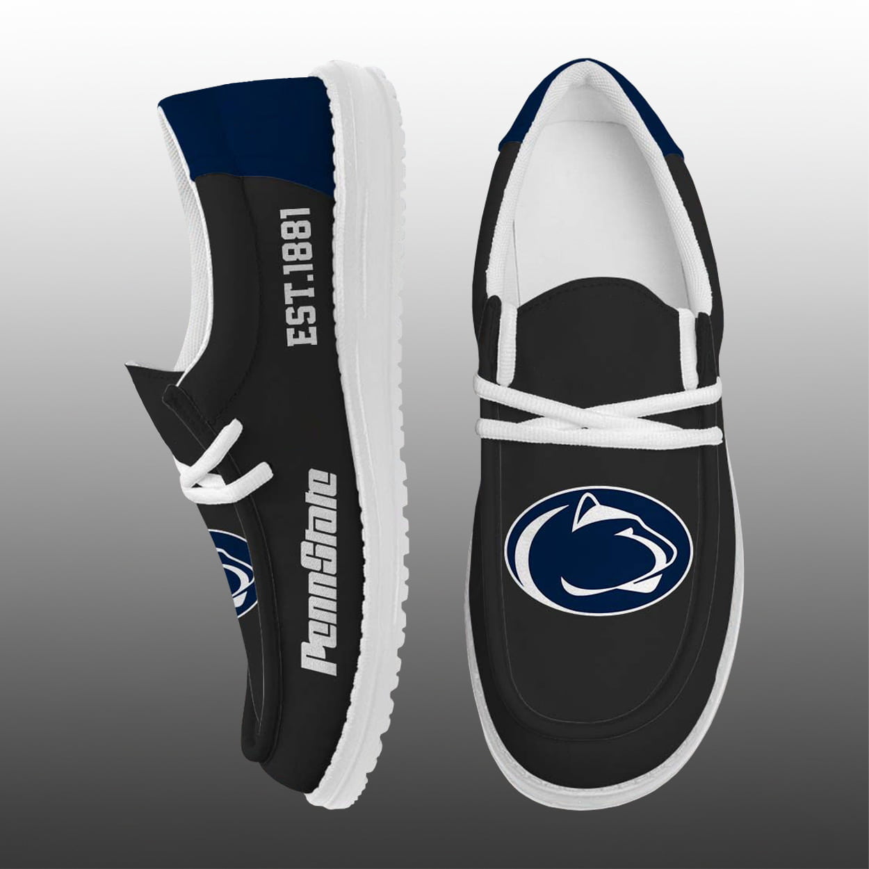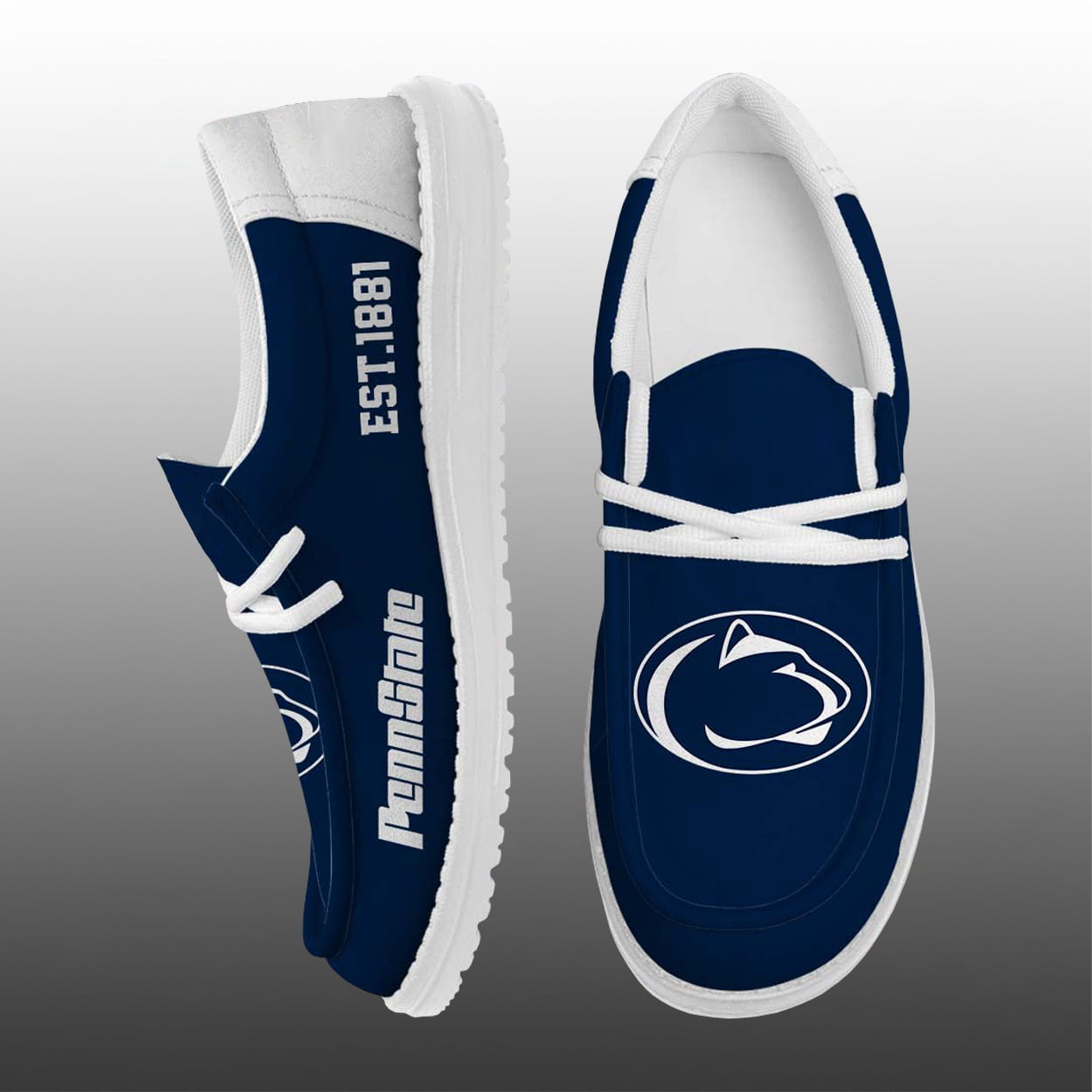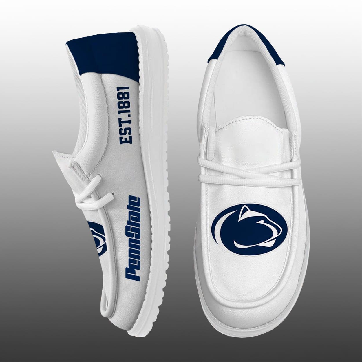 Step into tradition with this shoes—a sleek tribute to the university’s iconic heritage. These navy blue kicks are accented with crisp white details that make every step pop. One shoe features the proud Penn State Nittany Lion logo boldly placed on the top, while the other showcases “PennState” along the side and “EST. 1881” vertically near the laces, marking the year this legendary institution began shaping minds. Whether you’re heading to a game, campus stroll, or casual hangout, these shoes are a stylish way to rep your alma mater.
