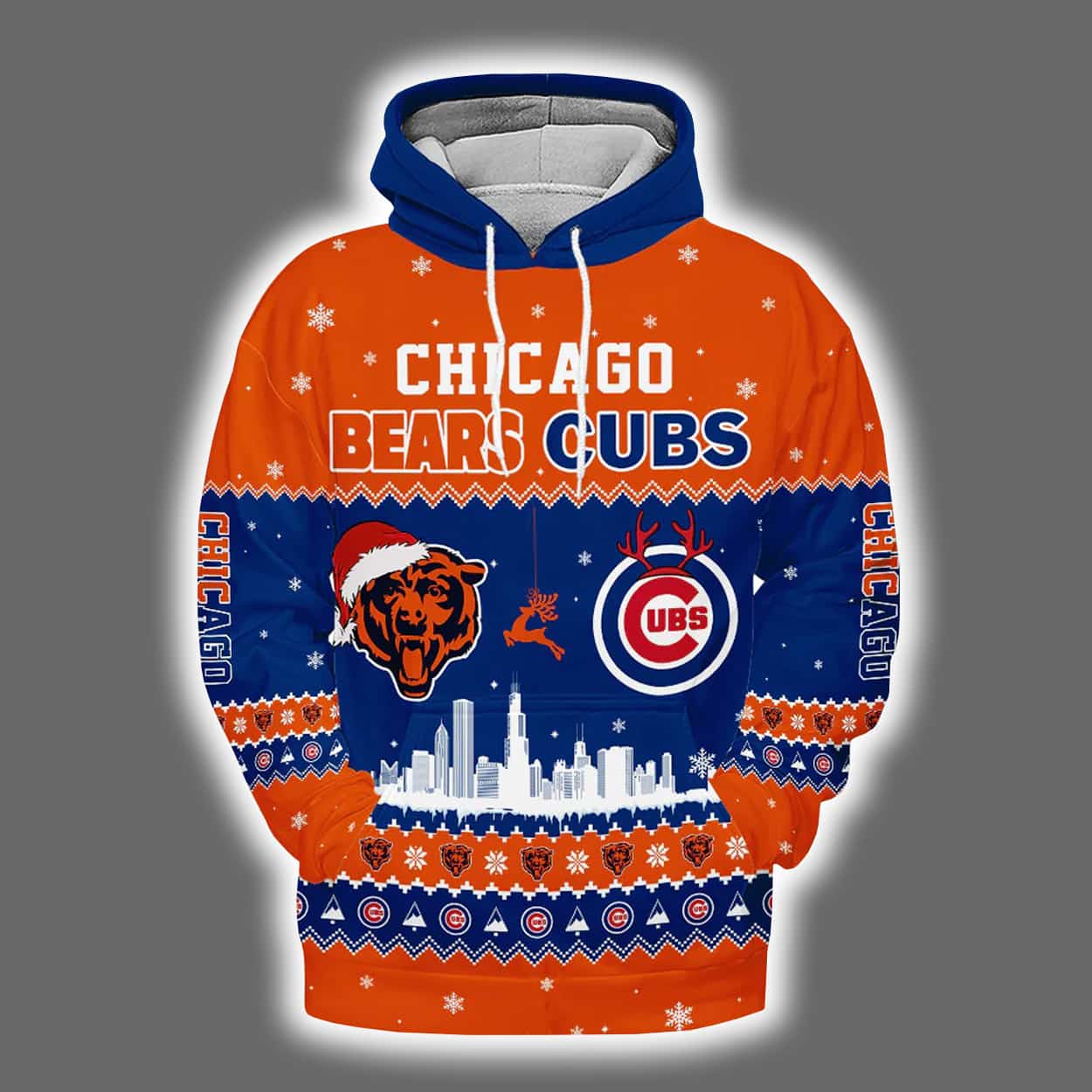 Get ready to sleigh the season with the ultimate fan gear mashup! Bursting with orange, blue, and white holiday flair, this hoodie features classic snowflakes, reindeer, and a bold “CHICAGO BEARS CUBS” shout-out across the chest. The front showcases both team logos and a crisp white silhouette of the Chicago skyline, while the back takes personalization to the next level with a “YOUR NAME” banner and a circular emblem blending the Bears and Cubs insignias. It’s a wearable celebration of two powerhouse teams wrapped in festive spirit.