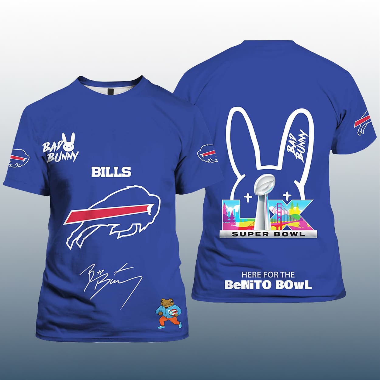 This shirt is a touchdown of style and star power. On the front, “BILLS” pops in crisp white beneath the iconic charging buffalo logo, while Bad Bunny’s name and bunny emblem add a splash of celebrity cool. His signature graces the lower corner, alongside a cartoon character rocking a Bills jersey—because why not mix football with flair? Flip to the back and you’ll find a giant bunny head outline with “BAD BUNNY” nestled in the ears, a vibrant SB LX logo, and the cheeky phrase “HERE FOR THE BeNITO BoWL” anchoring the look.