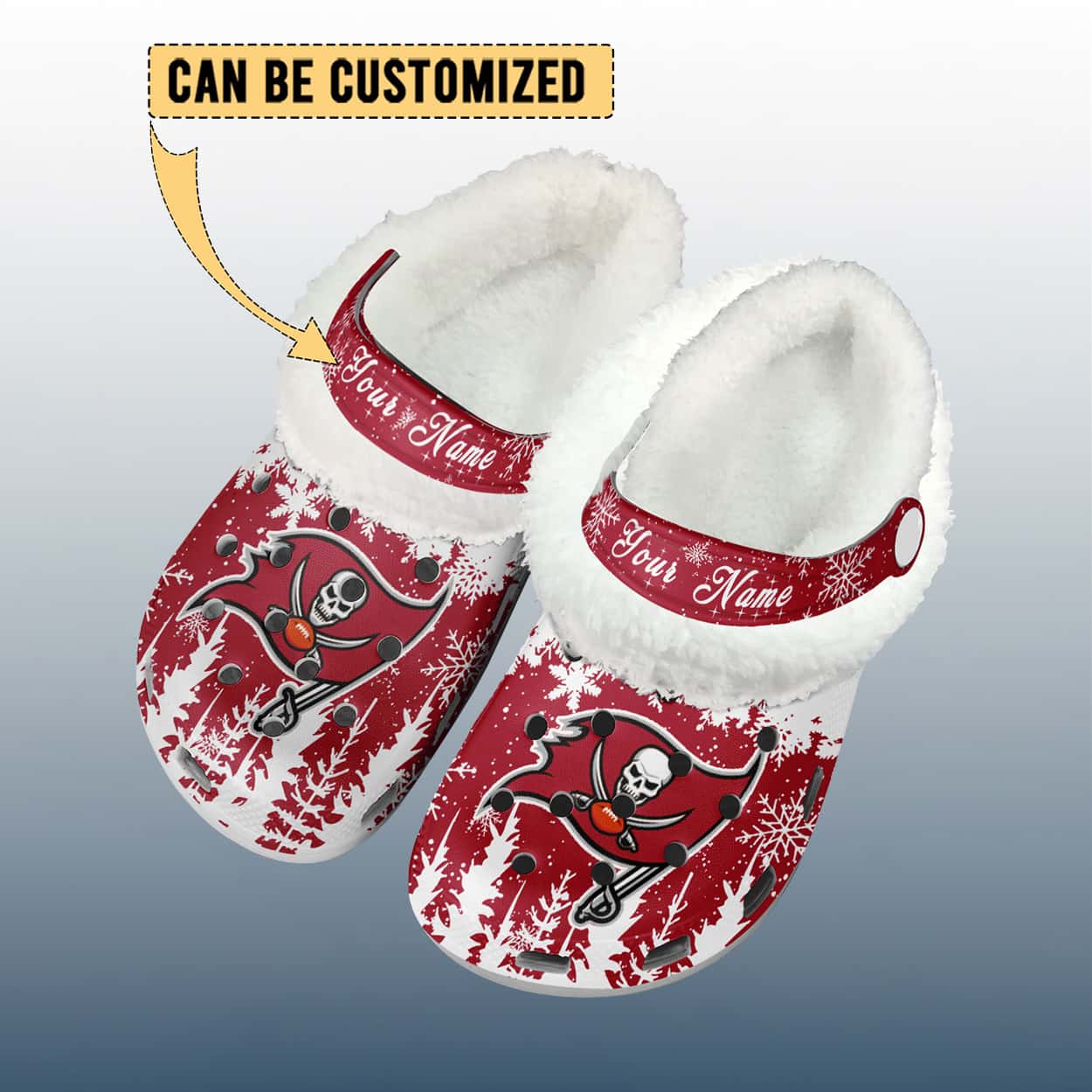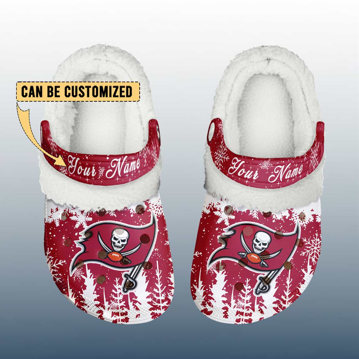 Get ready to sail through the holidays in style with this crocs. Drenched in bold red with crisp white accents, these clogs are a festive touchdown for your feet. The front proudly displays the Buccaneers logo, while snowflakes and tree silhouettes add a playful winter twist. The top strap reads “Your Name,” giving you the power to personalize your pair and make them uniquely yours.