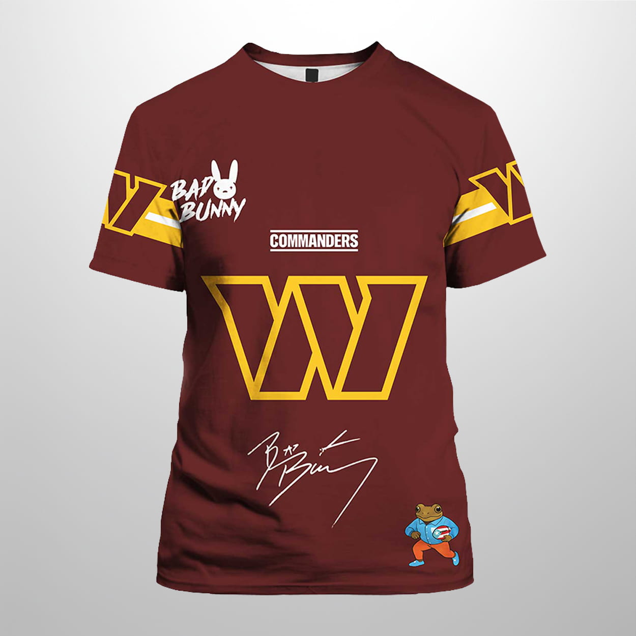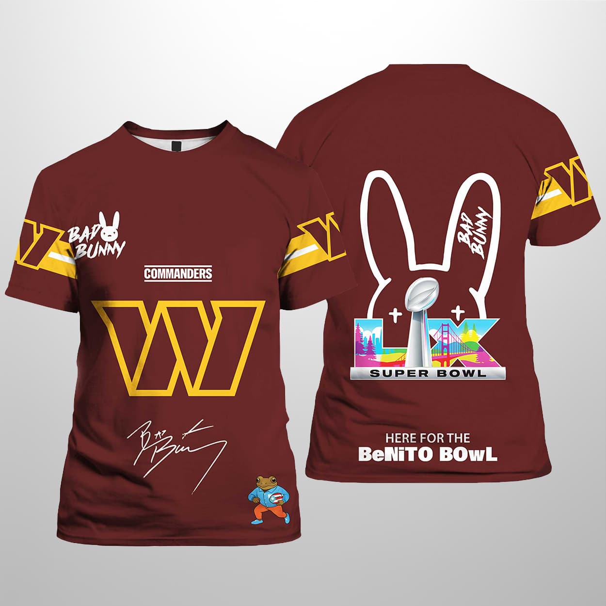 This shirt is a bold tribute to the ultimate crossover—grit meets global music stardom. The front features “COMMANDERS” in crisp white above a golden “W,” paired with “BAD BUNNY” and his signature bunny logo. A playful cartoon character and stylized autograph add flair near the bottom. Flip it over and the back explodes with personality: a giant bunny head outline with a lightning bolt on the forehead, “BAD BUNNY” stamped inside, and a vibrant “SB” graphic below. The phrase “HERE FOR THE BeNITO BoWL” seals the deal, making this shirt a must-have for fans who love their football with a side of reggaetón.