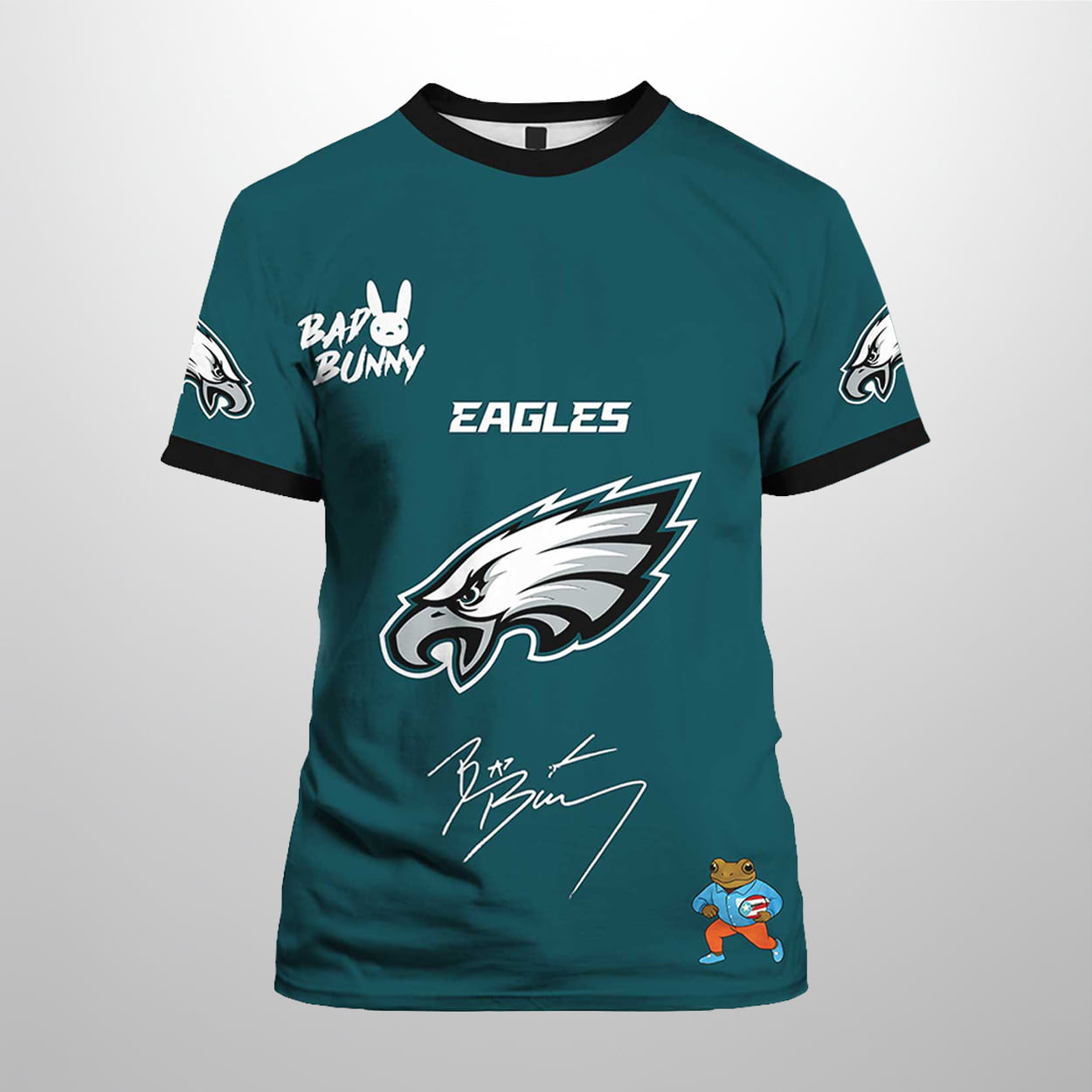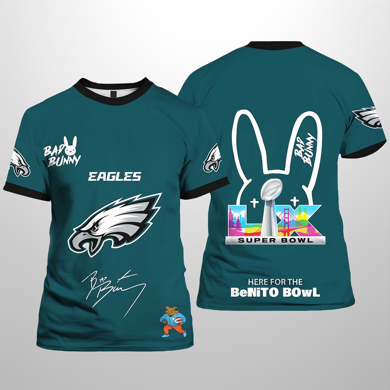 Get ready to soar in style with this shirt. The front rocks a vibrant green base with black trim, featuring “BAD BUNNY” in bold text topped by his iconic bunny logo. “EAGLES” blazes in white beneath the Eagles emblem, while a signature-style “Bad Bunny” adds superstar flair. A quirky cartoon bear near the hem brings unexpected charm. On the back, a large white bunny outline frames a circular Eagles logo, with a colorful “SB” graphic and cityscape below. The phrase “HERE FOR THE BeNiTO BoWL” seals the deal with playful attitude.