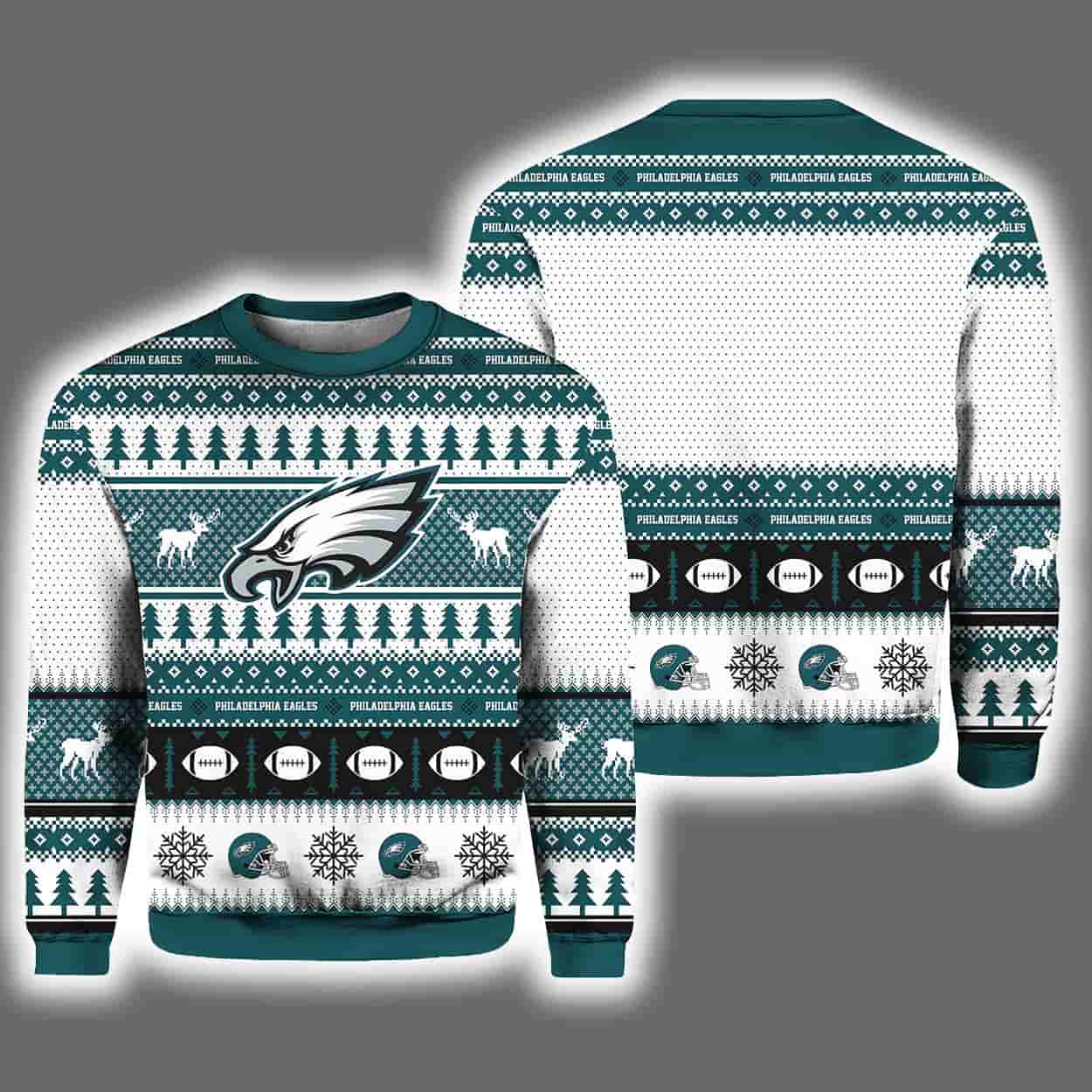 Deck the halls—and yourself—in gridiron glory with this sweater. This eye-catching design features the iconic Eagles logo front and center, surrounded by a festive flurry of snowflakes, reindeer, footballs, and Christmas trees. The white base pops with green and black accents, creating a winter wonderland that screams team pride. The back mirrors the front’s energy, with symmetrical rows of Eagles logos and football motifs that keep the holiday hype going from every angle.