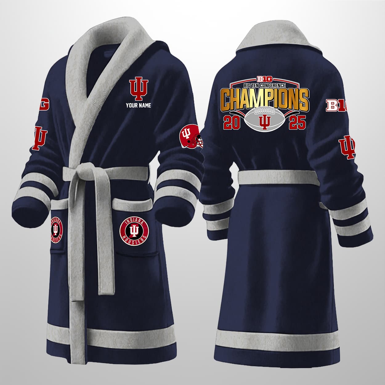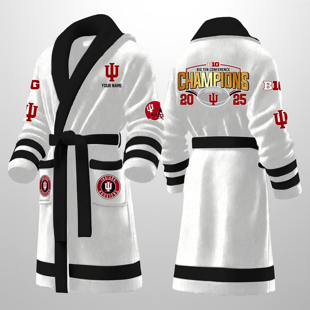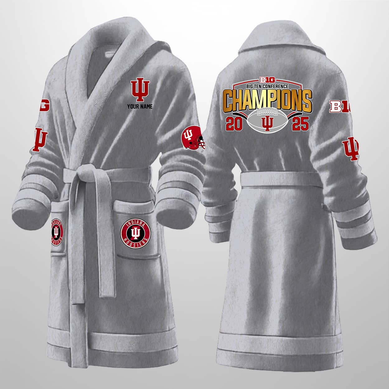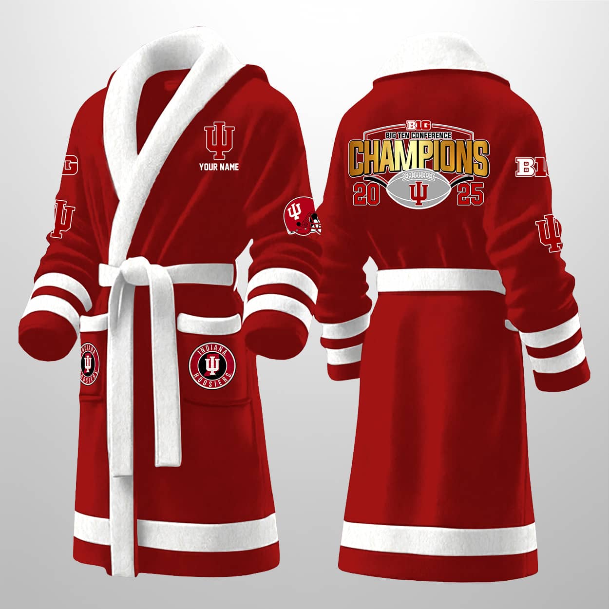 This isn’t your average bathrobe — it’s a championship celebration you can wear. Drenched in Hoosier red with crisp white trim, this robe features bold graphics that shout “BIG TEN FOOTBALL CHAMPIONS 2025” across the back, complete with a football emblem and the iconic IU logo. The front sports your personalized name above the chest logo, with additional IU on the sleeves and lower front for maximum fan flair. Whether you’re fresh out of the shower or just flexing your fandom on a lazy Sunday, this robe turns downtime into prime time.