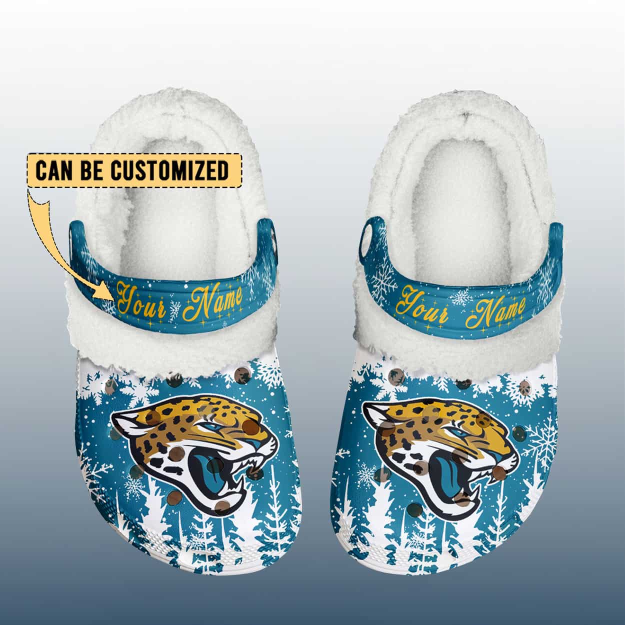 Roar into the holidays with this crocs—your ultimate blend of comfort, fandom, and seasonal charm. These clogs feature a cool blue-and-white winter motif, complete with snowflakes and pine tree silhouettes that set the scene for frosty fun. The front proudly displays the fierce Jaguars logo, while the plush white lining keeps your feet snug through every chilly snap. The standout feature? A customizable strap that reads “Your Name” in bold yellow, making these Crocs as personal as your game-day rituals.