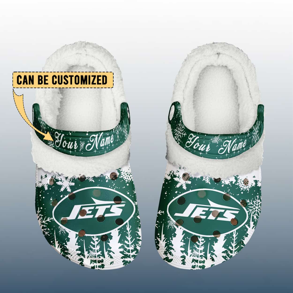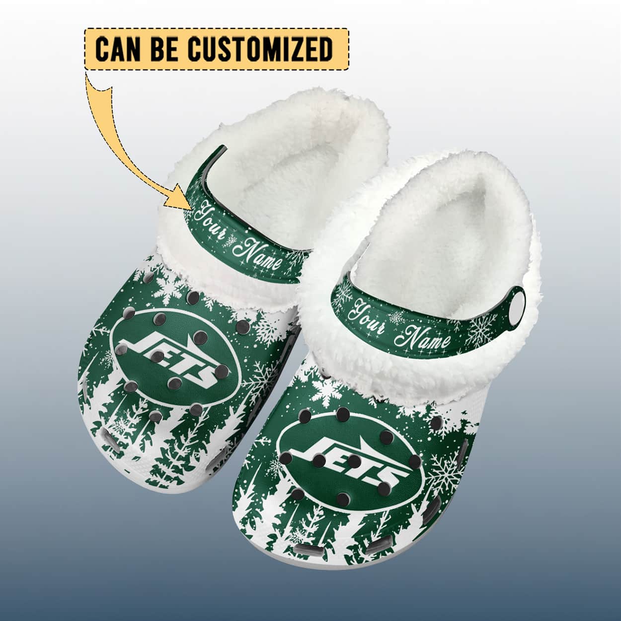 Take your fandom to frosty new heights with this crocs. These green-and-white clogs are decked out in a snowy scene of pine trees and snowflakes, creating a festive backdrop for the bold Jets logo that sits proudly front and center. The strap across the top adds a personal touch—customizable with your name—making these Crocs a unique tribute to your team spirit. Inside, the plush fleece lining keeps your feet warm whether you’re watching the game or dashing through the snow.
