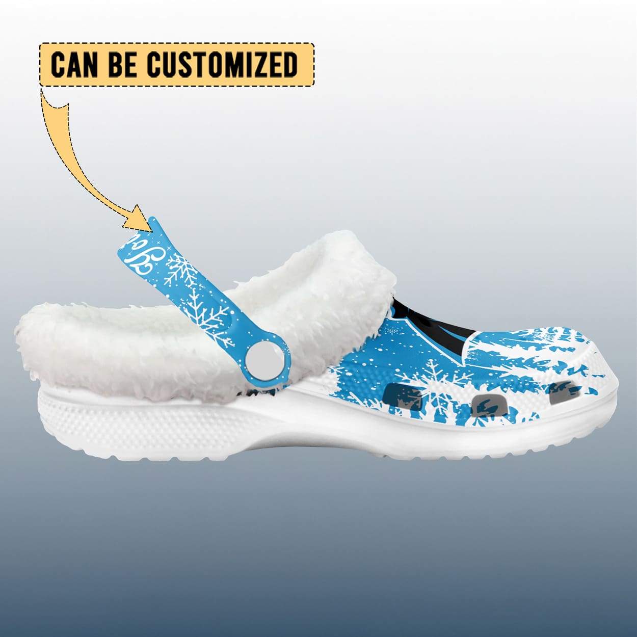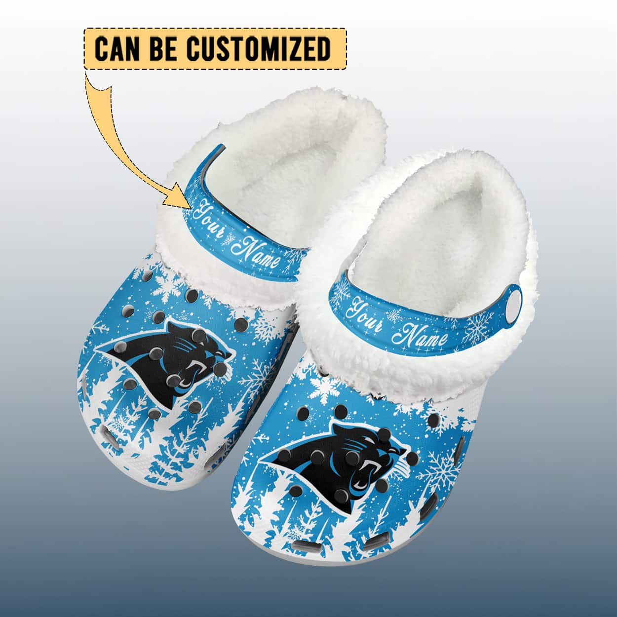 Step into winter with bold style and team spirit in this crocs. These vibrant blue clogs are decked out in seasonal charm, featuring crisp white snowflakes and pine tree silhouettes that bring holiday magic to your stride. The iconic Panthers logo roars across the front of each shoe, making your allegiance unmistakable. The top strap is your personal spotlight—customizable with your name in elegant cursive, turning these Crocs into a one-of-a-kind fan favorite. Whether you’re cozying up by the fire or cheering from the couch, these Crocs deliver comfort with a fierce dose of Panthers pride.