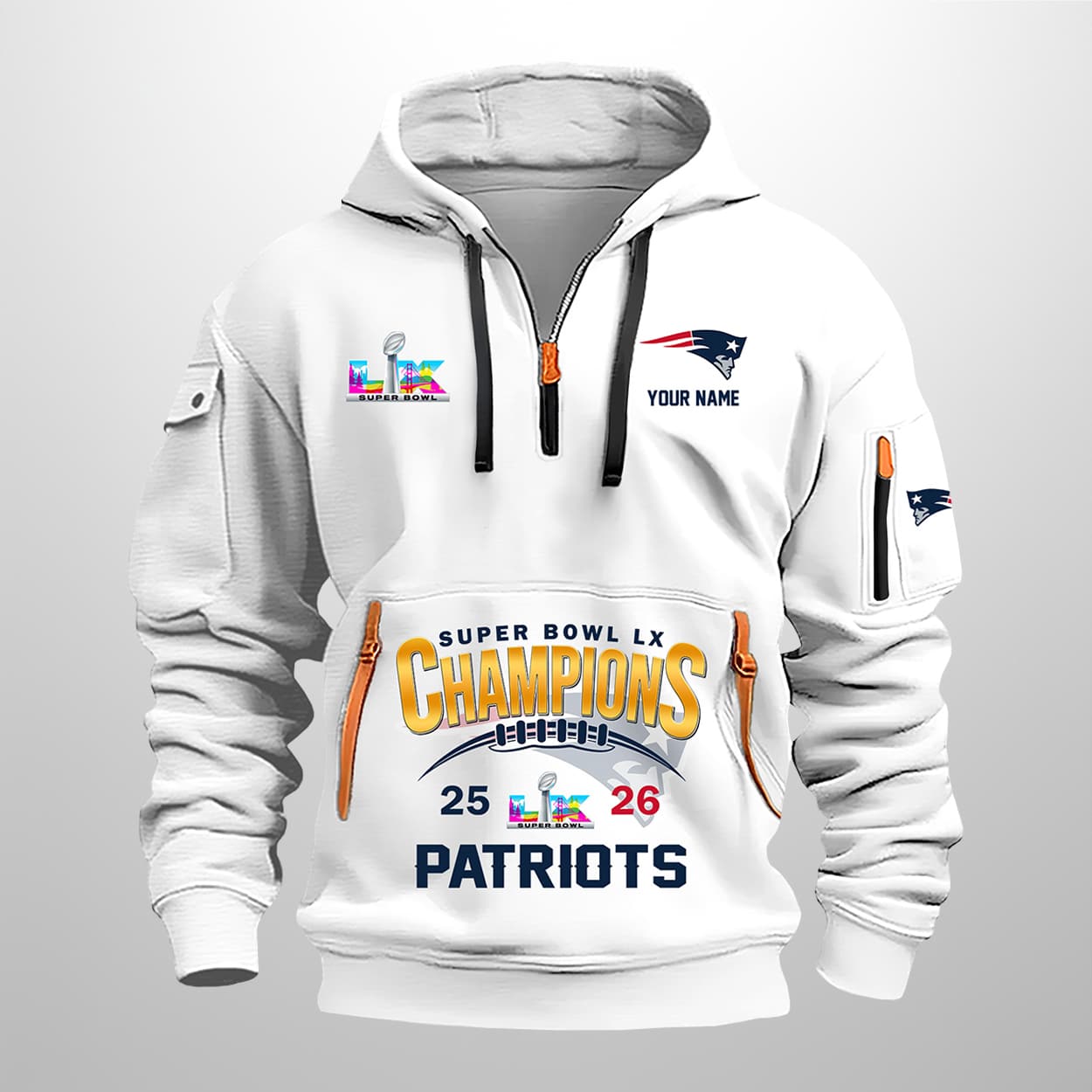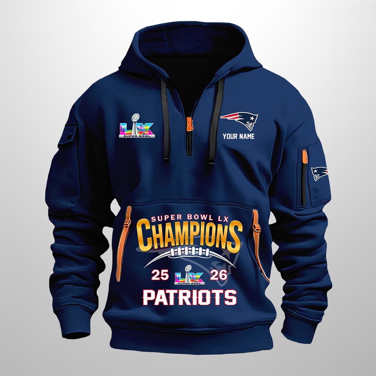 This hoodie is the ultimate way to showcase your loyalty and style. The front proudly announces “SUPER BOWL LX CHAMPIONS 25 26 PATRIOTS” in bold lettering, with the Vince Lombardi Trophy standing tall between the numbers. On the left chest, a vibrant “LIX” logo adds a splash of color, while the right chest features the Patriots logo with space for your personalized name—making this hoodie uniquely yours. Orange zipper accents on the front and sleeve pockets add a playful twist, while the sleeve patch with the Patriots logo ties the look together.