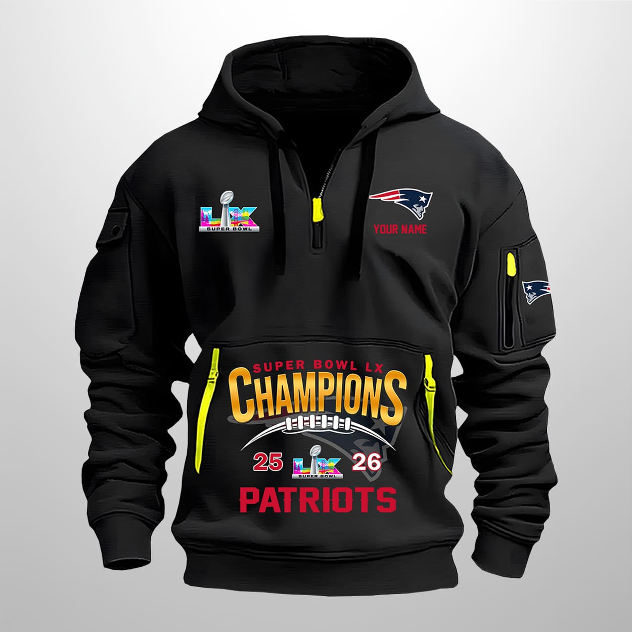 Celebrate your team’s triumph with the Personalized Patriots 25-26 Super Bowl LX Champions Hoodie Half Zipper—an eye-catching design that fuses bold graphics, championship pride, and fan individuality into one unforgettable piece.