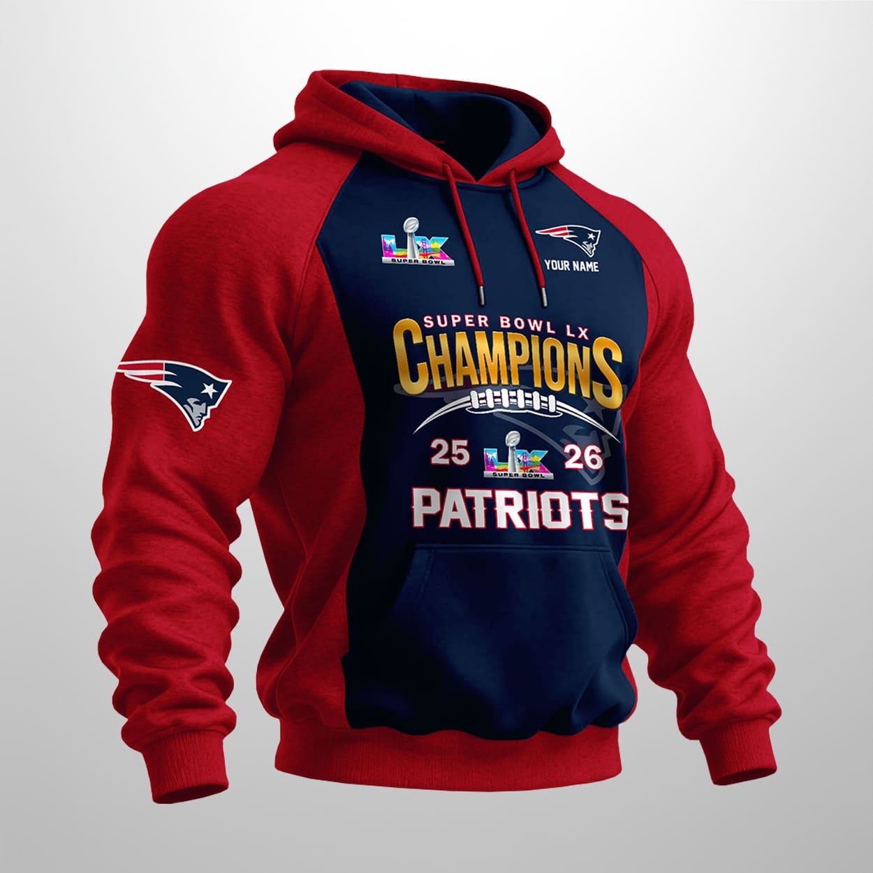 Turn every day into a victory lap with this hoodie. The front bursts with energy, showcasing “SUPER BOWL LX CHAMPIONS” in bold yellow and white lettering, framed by a football graphic and the championship years “25” and “26.” Just below, “PATRIOTS” stands proudly in crisp white, while the Super Bowl LX logo and team emblem crown the design. On the sleeve, a larger Patriots logo adds extra flair, and the right chest area offers personalization with “YOUR NAME,” making this hoodie uniquely yours.