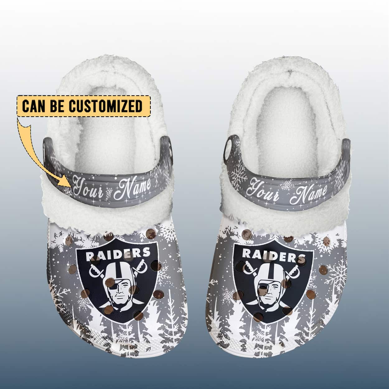 Celebrate the season with silver-and-black swagger in Personalized Raiders Winter Christmas Fleece Crocs—festive, cozy, and custom-made for fans who live for the game.