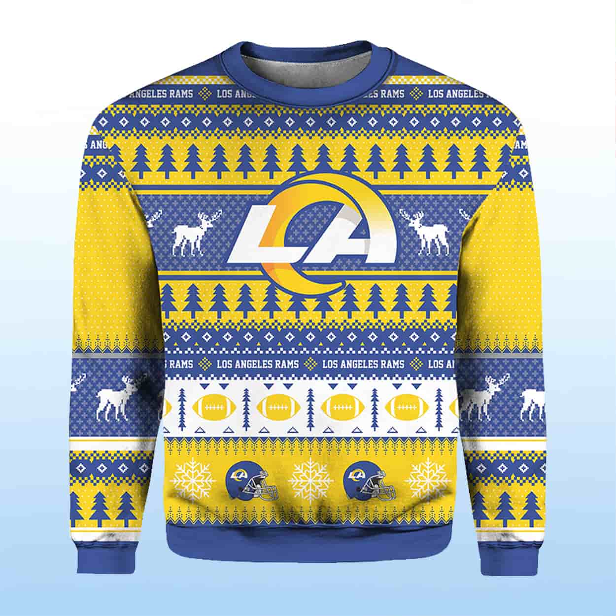 This sweater is a touchdown of holiday spirit and team loyalty. Drenched in vibrant blue, yellow, and white, this sweater features the iconic Rams logo front and center, surrounded by a festive flurry of snowflakes, reindeer, football helmets, and Christmas trees. The text “RAMS” repeats proudly across the chest and upper back, making it clear who you’re cheering for—whether you’re decking the halls or dominating the fantasy league. With symmetrical patterns and bold colors, it’s a visual celebration of both the holidays and your favorite team.