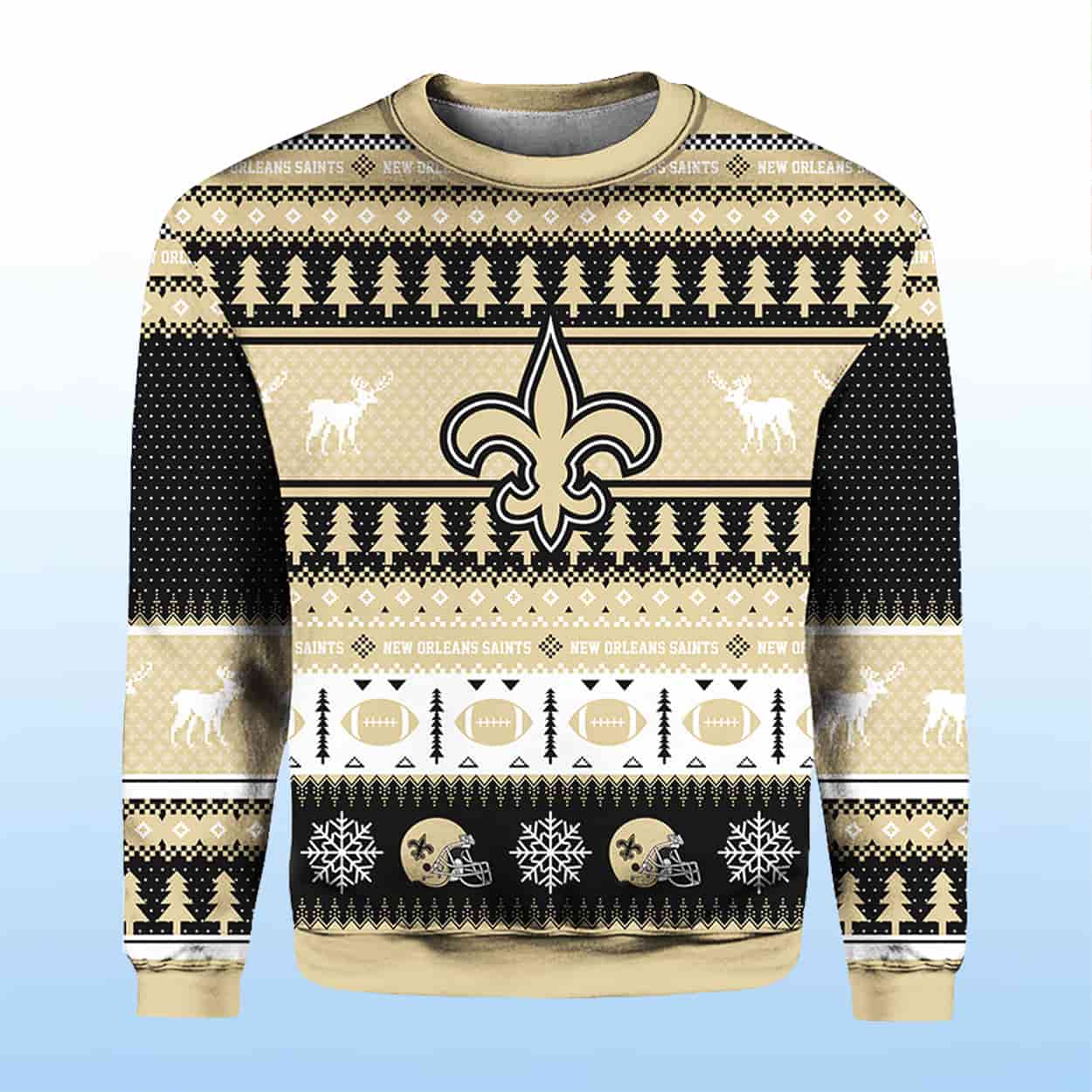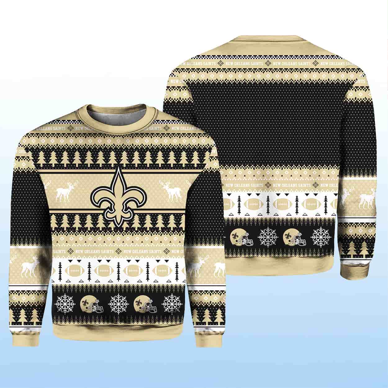 This sweater is a touchdown of holiday spirit and team devotion. Drenched in the iconic black, gold, and white palette of the Saints, this sweater features the team’s bold fleur-de-lis logo front and center, surrounded by rows of snowflakes, reindeer, and Christmas trees. The festive patterns wrap around the entire sweater, with the back continuing the holiday cheer minus the logo, keeping the look balanced and bold. Whether you’re tailgating in December or trimming the tree, this sweater brings the Saints’ swagger to every celebration.