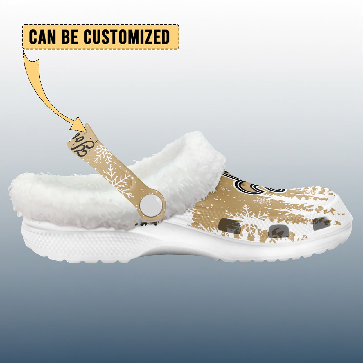 Step into seasonal spirit with this crocs. These beige-and-white clogs are dressed in a snowy landscape of pine trees and snowflakes, setting the perfect backdrop for the bold fleur-de-lis logo that proudly represents Saints pride. The strap across the top adds a personal touch—customizable with your name—making these Crocs a unique tribute to your team loyalty. Inside, the soft fleece lining keeps your feet warm whether you’re cheering from the couch or strolling through a winter wonderland.
