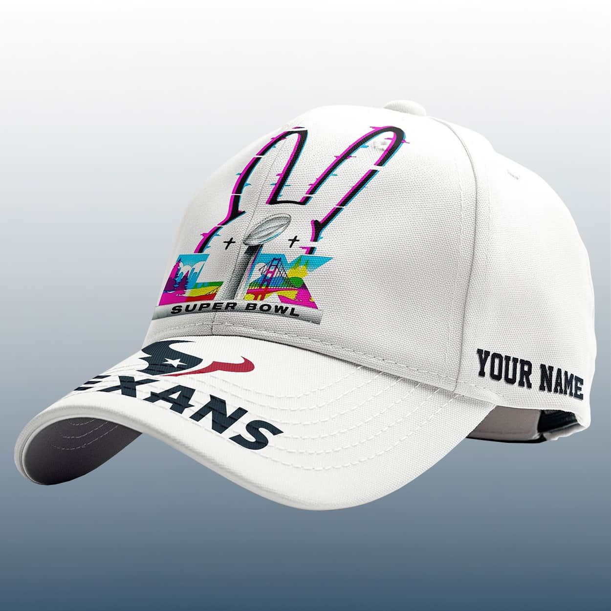 Get ready to flex your fandom with this cap—a head-turning fusion of football fire and pop culture impact. The front panel rocks a vibrant SB LX logo, crowned by neon-outlined bunny ears that scream Bad Bunny vibes. Just below, “SB” anchors the design in bold clarity. The brim brings it home with the Texans logo and “TEXANS” in fierce red lettering. And the cherry on top? Your name stitched in red on the side, making this cap uniquely yours.