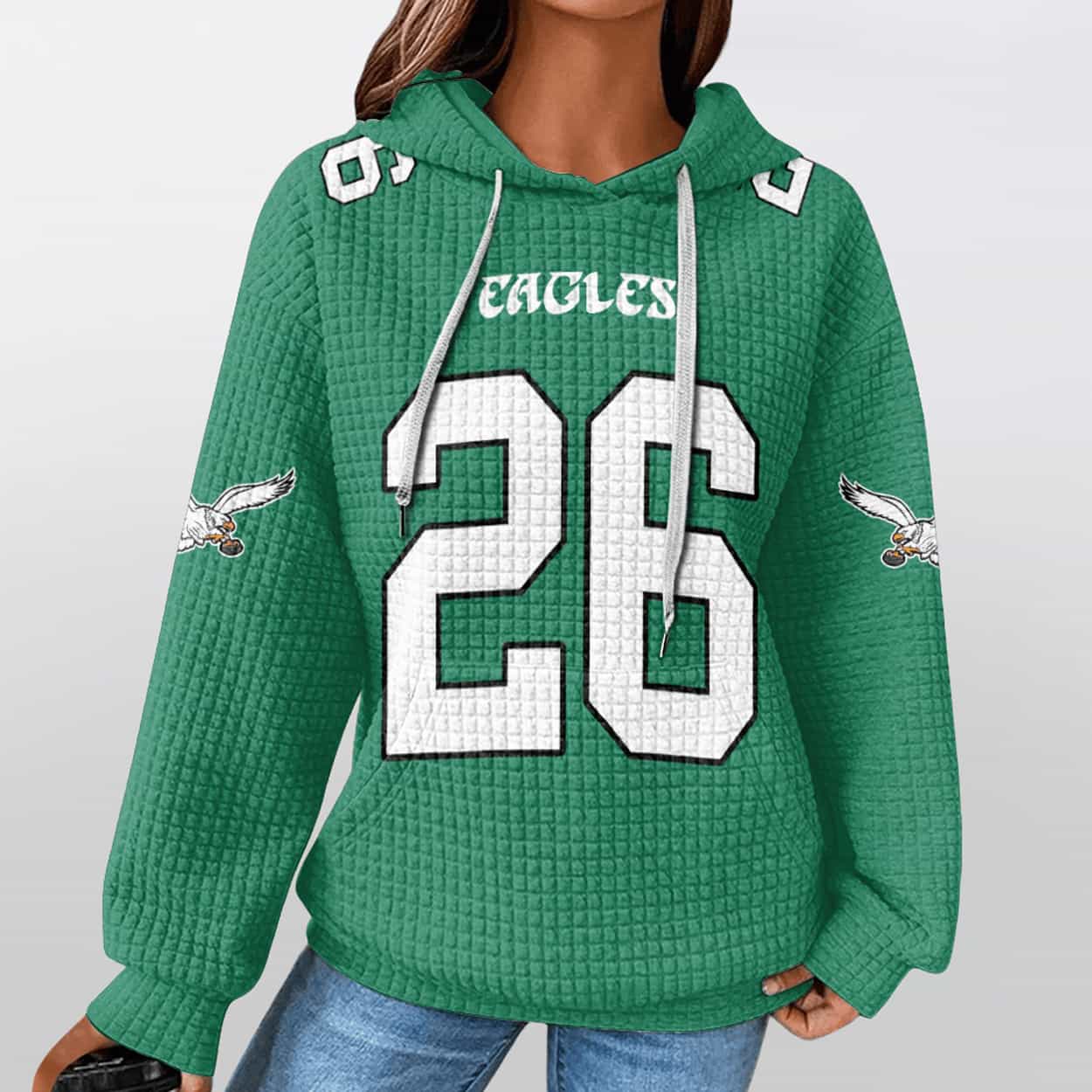 Show off your Eagles pride with the Philadelphia Saquon Barkley 26 Football Waffle Hoodie — a bold, jersey-inspired hoodie that blends streetwear swagger with gridiron greatness.
