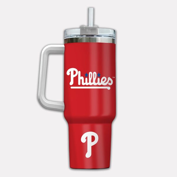 Get ready to swing for the fences with the Phillies 3 Bryce Harper Signature Tumbler, a 40oz masterpiece that’s as tough as Harper’s batting average! One side proudly displays the iconic Philadelphia Phillies logo in crisp white, while the other side features a dynamic illustration of Bryce Harper mid-swing, jersey number 3 blazing, with his name and “Philadelphia Baseball” etched below. The handle adds a practical yet stylish touch, and the clear lid with a sliding closure ensures no spills – because even champs like Harper need a steady hand! This tumbler is a must-have for any Phillies diehard.