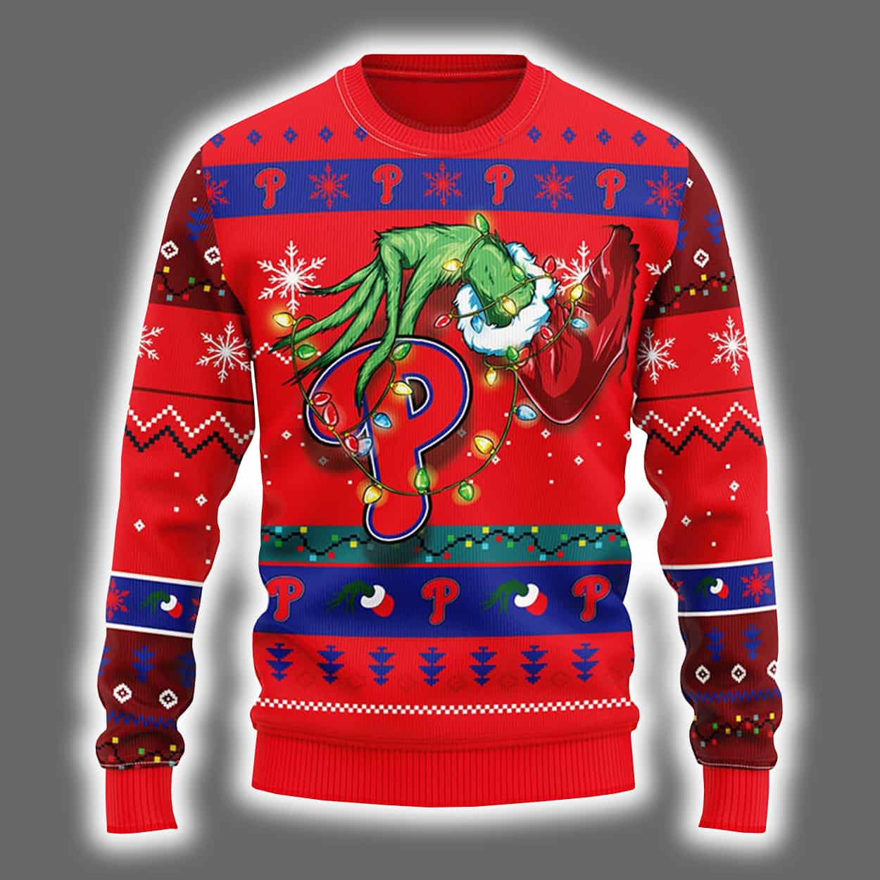 Swipe the Season in Style with the Phillies Grnch Hand Ugly Christmas Sweater!