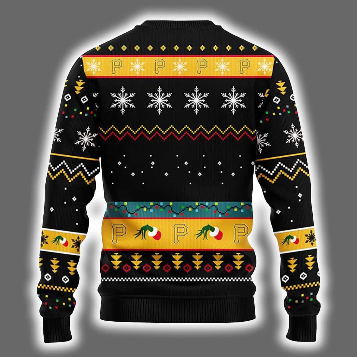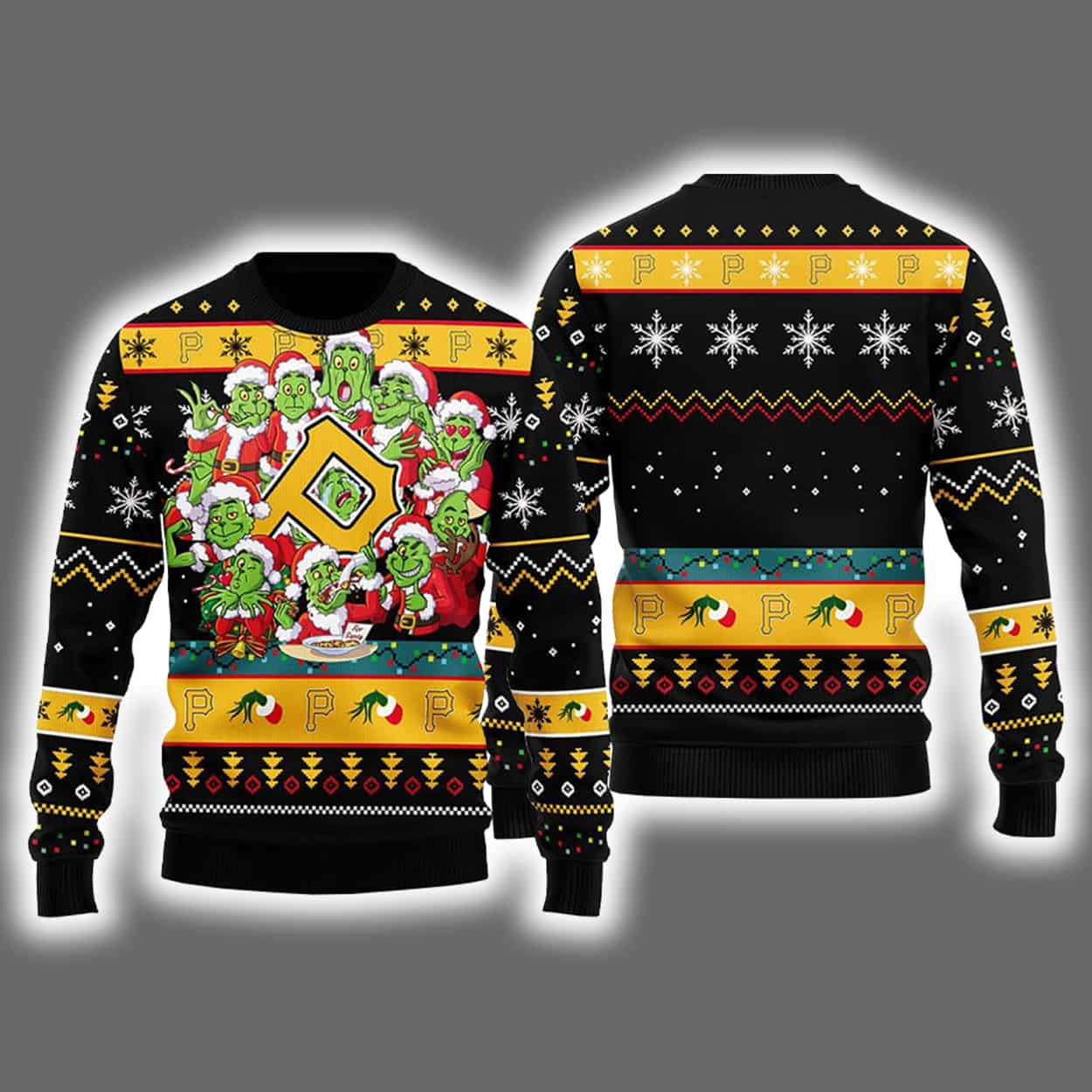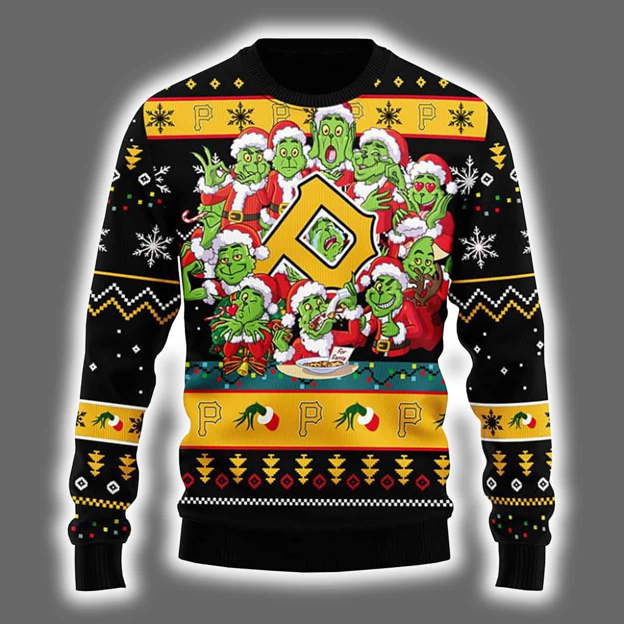 This isn’t your grandma’s Christmas sweater. This sweater is a riot of holiday spirit and rebellious flair. Front and center, a gang of green-faced Grinch-like characters don red Santa suits as they huddle around a table emblazoned with a bold yellow-and-black “P” emblem—an unmistakable nod to the Pittsburgh Pirates. Snowflakes swirl across a black backdrop, while zigzag and diamond patterns dance across the sleeves and hem. Holly leaves, festive motifs, and the iconic “P” repeat in a joyful chaos that screams holiday mischief.