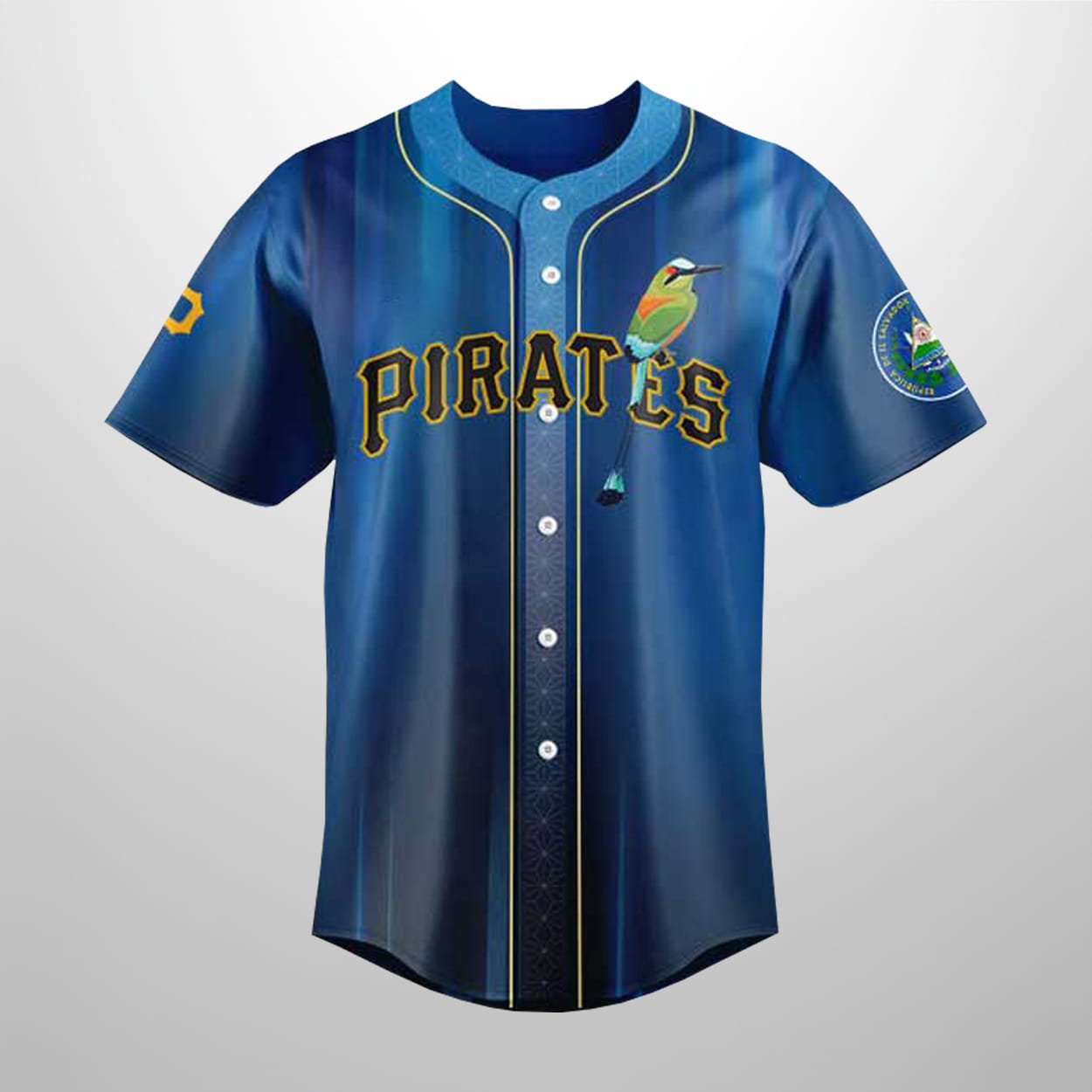 Set sail with a look that combines Pittsburgh’s grit with Salvadoran soul! This jersey features a stunning deep-blue gradient base with sleek vertical light-blue accents. On the front, the classic “Pirates” script in bold gold and black is paired with a vibrant Torogoz—the national bird of El Salvador—perched gracefully on the lettering. The back makes a powerful statement with “El Salvador” elegantly scripted above a massive gold “P”. Grounding the entire design is a crisp white silhouette of the Monumento al Divino Salvador del Mundo, connecting the diamond to the heart of the motherland.