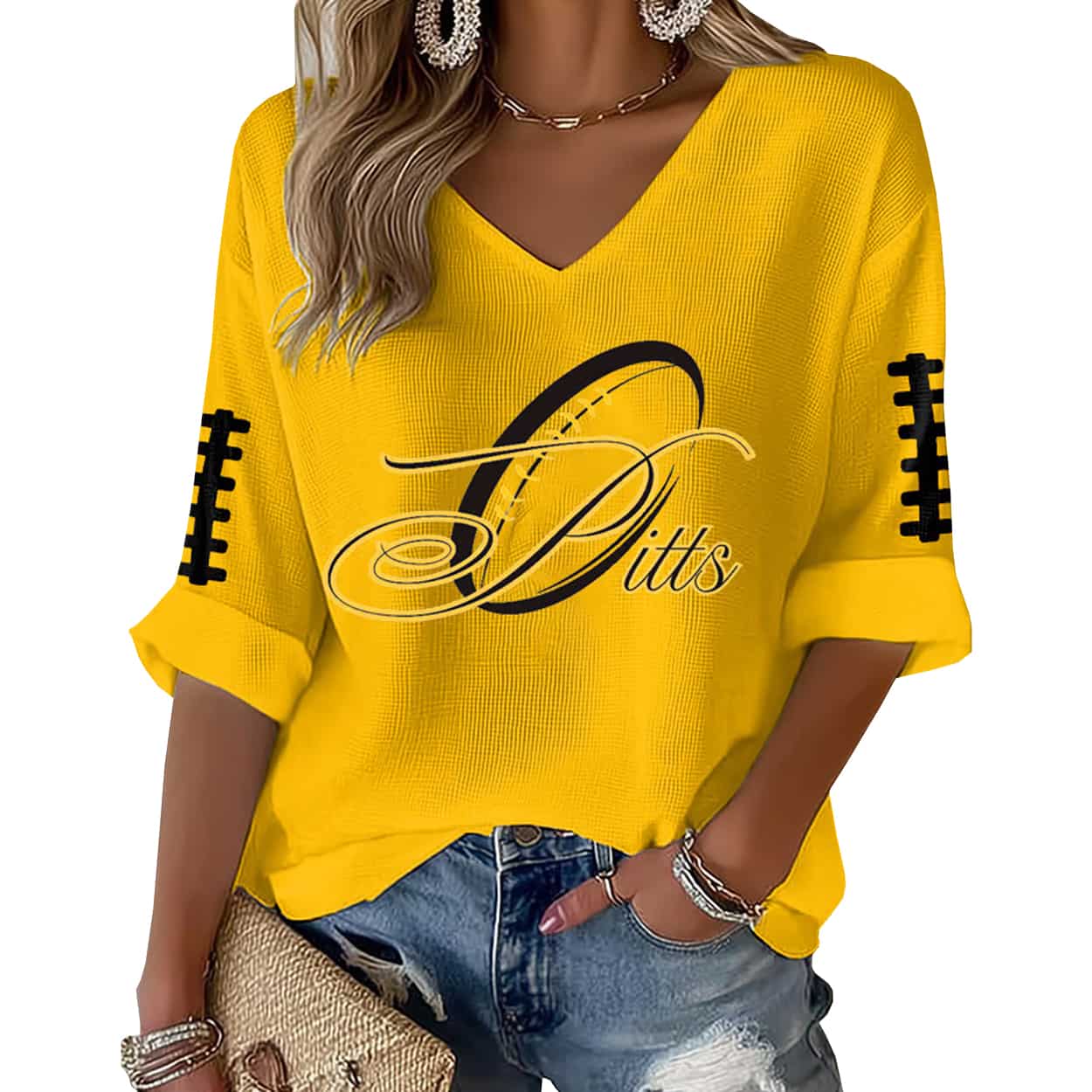This shirt features “Pitts” in a bold, stylized script across the chest, with a football graphic that’s subtly integrated—like a play-action pass for your wardrobe. Yellow football lace graphics on each sleeve add a sporty flair, while the relaxed fit and textured fabric keep things breathable and bold.
