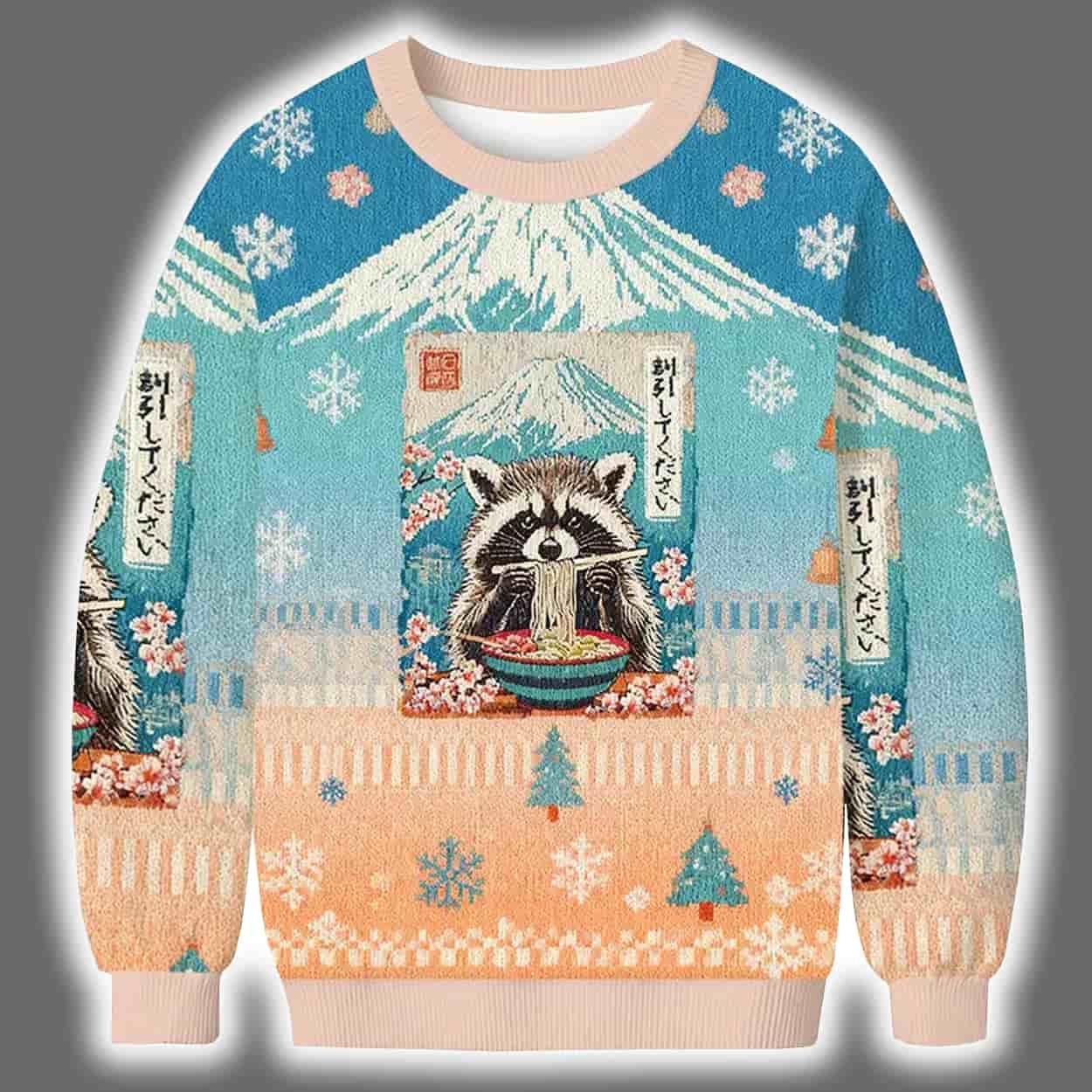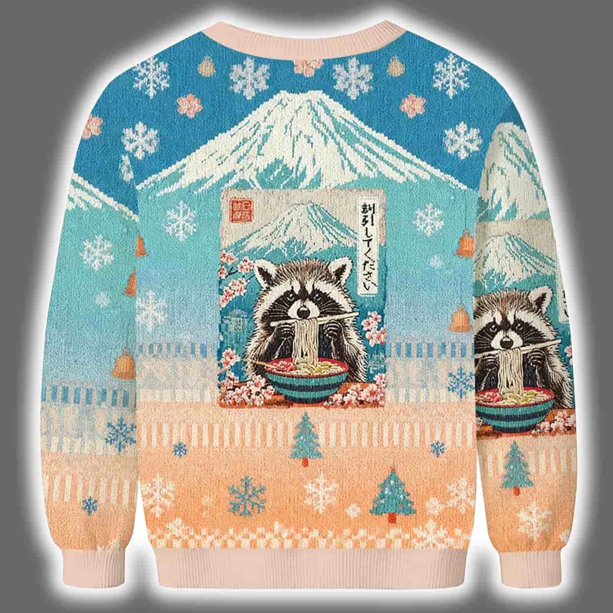 This holiday season, let your sweater do the talking—and the begging. This sweater is a visual feast of festive charm and cultural flair. Featuring a serene winter scene with snow-covered Mount Fuji, delicate snowflakes, and tranquil pine trees, the design centers around a raccoon clutching a steaming bowl of ramen in front of a traditional Japanese building. Japanese characters add authenticity and intrigue, while the harmonious blend of blue, peach, and white tones wraps the entire garment in a peaceful, snowy aesthetic. Front and back, the design flows seamlessly, making this sweater a wearable winter wonderland.